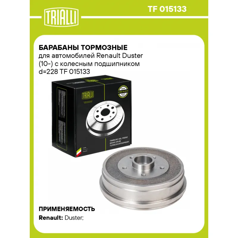 Барабаны тормозные для автомобилей Renault Duster (10-) c колесным подшипником d=228 Характеристики: Артикул: TF 015133 OEM номера: 432008310R, 432008208R, 432005445R, 43 20 070 75R Количество на автомобиль: 2 Количество в коробке, шт.: 1 Особенности конструкции:: с интегрированным колесным подшипником Внутр. высота торм. барабана: 50,5 Гарантийный срок: 2 года / 60 000 км Сторона установки: Задняя ось Материал: Чугун, сталь Общая высота торм. барабана: 91,5 Количество отверстий: 5 Диаметр центрирования: 52.3 Наружный диаметр, мм: 260 Максимальный размер расточки тормозного барабана: 229.5 Разболтовка (PCD): 5*114,3 Сопутствующий товар: Колодки тормозные барабанные: GF 0957 Сопутствующий товар: Цилиндры заднего тормоза: CF 1663 Товарная линейка: BLACK Внутренний диаметр торм. барабана: 228.5 Подходит для авто: Renault Duster (10-), Duster (10-) Для проверки применяемости отправьте VIN автомобиля через вкладку "Есть вопросы о товаре?" Комплектация: Барабан тормозной - 1 шт Гарантия: от 1 года.