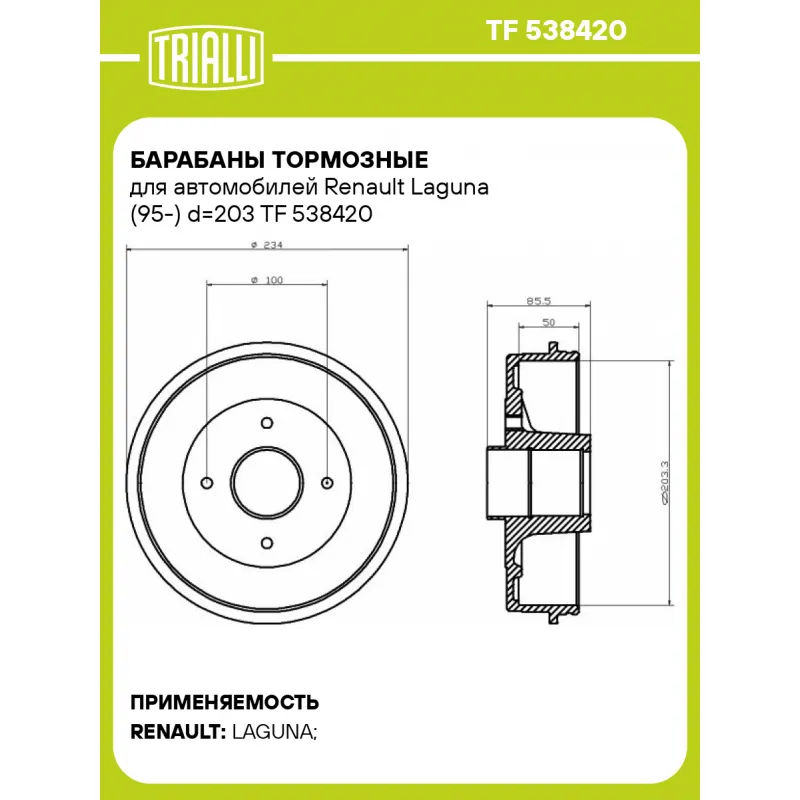 Барабаны тормозные для автомобилей Renault Laguna (95-) d=203 Характеристики: Артикул: TF 538420 OEM номера: 7700840711, 77 00 820 816 Диаметр центрирования: 55 Диаметр располож. креп. отверстий: 100 Внутр. высота торм. барабана: 50 Общая высота торм. барабана: 85.5 Количество отверстий: 4 Наружный диаметр, мм: 234 Максимальный размер расточки тормозного барабана: 204.5 Разболтовка (PCD): 4*100 Гарантийный срок: 2 года / 60 000 км Сторона установки: Задняя ось Сопутствующий товар: Колодки тормозные барабанные: GF 0959 Сопутствующий товар: Цилиндры заднего тормоза: CF 0311 Количество в коробке, шт.: 1 Внутренний диаметр торм. барабана: 203 Количество на автомобиль: 2 Материал: Серый чугун Товарная линейка: BLACK Комплектация: Барабан тормозной - 1 шт Гарантия: от 1 года.
