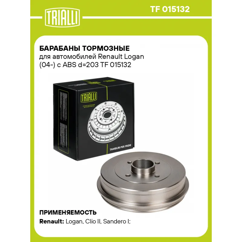 Барабаны тормозные для автомобилей Renault Logan (04-) с ABS d=203 Характеристики: Артикул: TF 015132 OEM номера: 8200243735, 7700428821, 7700827866, 6001547703, 77 00 839 322, 77 00 818 346, 43 20 262 94R, 43 20 266 17R Количество на автомобиль: 2 Количество в коробке, шт.: 2 Особенности конструкции:: без подшипники и кольца ABS Внутр. высота торм. барабана: 50.5 Гарантийный срок: 2 года / 60 000 км Материал: Чугун Общая высота торм. барабана: 76 Количество отверстий: 4 Диаметр центрирования: 52 Наружный диаметр, мм: 234 Максимальный размер расточки тормозного барабана: 204.5 Разболтовка (PCD): 4*100 Сопутствующий товар: Колодки тормозные барабанные: GF 0960 Сопутствующий товар: Цилиндры заднего тормоза: CF 0942 Товарная линейка: BLACK Внутренний диаметр торм. барабана: 203 Сторона установки: Задняя ось Подходит для авто: Renault Logan (04-), Clio II (98-), Sandero I (09-), Symbol II (08-), Twingo (96-), Twingo (07-), Sandero II (14-), Logan (04-), Logan (08-), Clio II (98-), Megane I (95-), Megane I (95-) Для проверки применяемости отправьте VIN автомобиля через вкладку "Есть вопросы о товаре?" Комплектация: Барабан тормозной - 1 шт Гарантия: от 1 года.