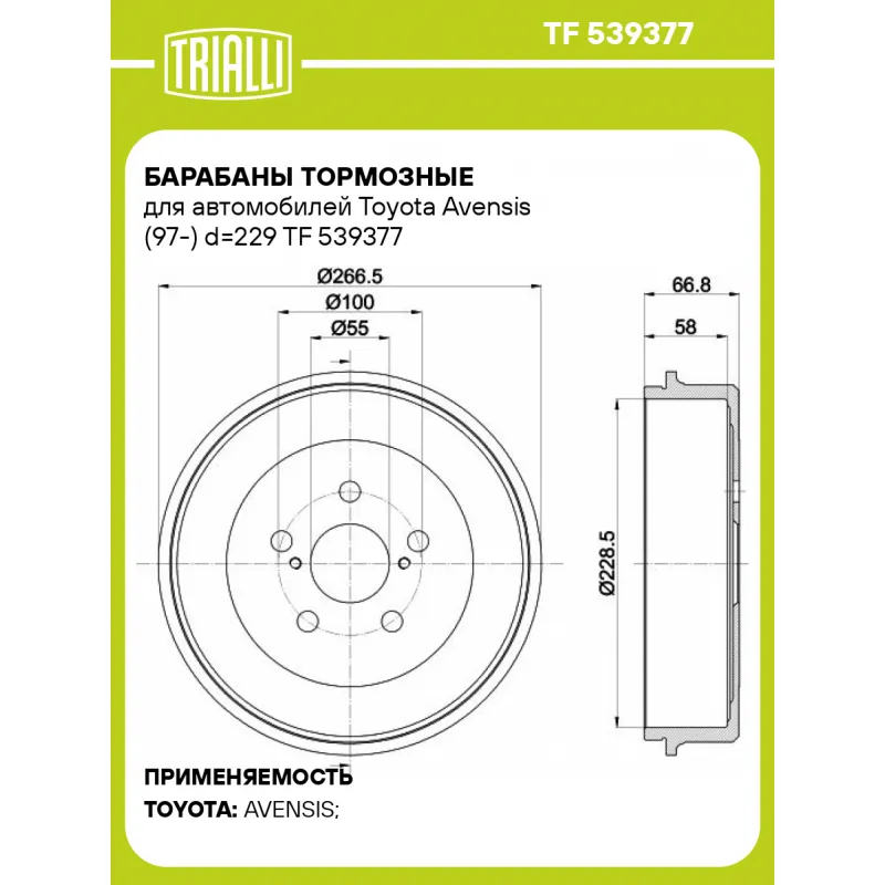 Барабаны тормозные для автомобилей Toyota Avensis (97-) d=229 Характеристики: Артикул: TF 539377 OEM номера: 4243105020 Диаметр центрирования: 55 Диаметр располож. креп. отверстий: 100 Внутр. высота торм. барабана: 58 Общая высота торм. барабана: 66.5 Количество отверстий: 5 Наружный диаметр, мм: 266.5 Максимальный размер расточки тормозного барабана: 229.6 Разболтовка (PCD): 5*100 Гарантийный срок: 2 года / 60 000 км Сторона установки: Задняя ось Сопутствующий товар: Колодки тормозные барабанные: GF 4817 Сопутствующий товар: Цилиндры заднего тормоза: CF 1950 Количество в коробке, шт.: 2 Внутренний диаметр торм. барабана: 229 Количество на автомобиль: 2 Материал: Серый чугун Товарная линейка: BLACK Комплектация: Барабан тормозной - 1 шт Гарантия: от 1 года.