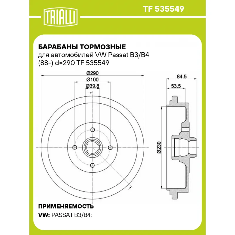 Барабаны тормозные для автомобилей VW Passat B3/B4 (88-) d=290 Характеристики: Артикул: TF 535549 OEM номера: 357501615, 14592710 Гарантийный срок: 2 года / 60 000 км Сопутствующий товар: Колодки тормозные барабанные: GF 1865 Сопутствующий товар: Цилиндры заднего тормоза: CF 2001;CF 2002 Количество на автомобиль: 2 Количество в коробке, шт.: 1 Внутр. высота торм. барабана: 55,5 Материал: Чугун Общая высота торм. барабана: 84,3 Количество отверстий: 4 Диаметр центрирования: 39,8 Наружный диаметр, мм: 290 Максимальный размер расточки тормозного барабана: 231,5 Разболтовка (PCD): 4*100 Товарная линейка: BLACK Внутренний диаметр торм. барабана: 230 Сторона установки: Задняя ось Комплектация: Барабан тормозной - 1 шт Гарантия: от 1 года.