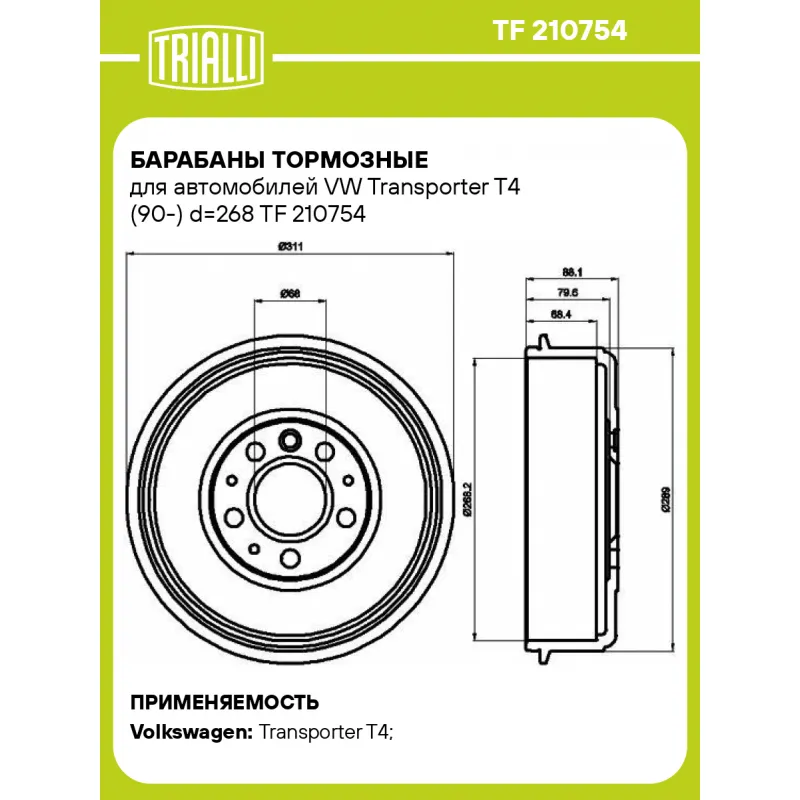 Барабаны тормозные для автомобилей VW Transporter T4 (90-) d=268 Характеристики: Артикул: TF 210754 OEM номера: 701 609 617 Количество на автомобиль: 2 Гарантийный срок: 2 года / 60 000 км Сторона установки: Задняя ось Материал: Чугун Внутр. высота торм. барабана: 72.1 Общая высота торм. барабана: 88 Количество отверстий: 5 Диаметр центрирования: 68 Наружный диаметр, мм: 310.7 Максимальный размер расточки тормозного барабана: 269.5 Разболтовка (PCD): 5*112 Сопутствующий товар: Колодки тормозные барабанные: GF 1861 Сопутствующий товар: Цилиндры заднего тормоза: CF 1846 Товарная линейка: BLACK Количество в коробке, шт.: 1 Внутренний диаметр торм. барабана: 268.1 Подходит для авто: Volkswagen Transporter T4 (90-), Transporter T4 (90-) Для проверки применяемости отправьте VIN автомобиля через вкладку "Есть вопросы о товаре?" Комплектация: Барабан тормозной - 1 шт Гарантия: от 1 года.