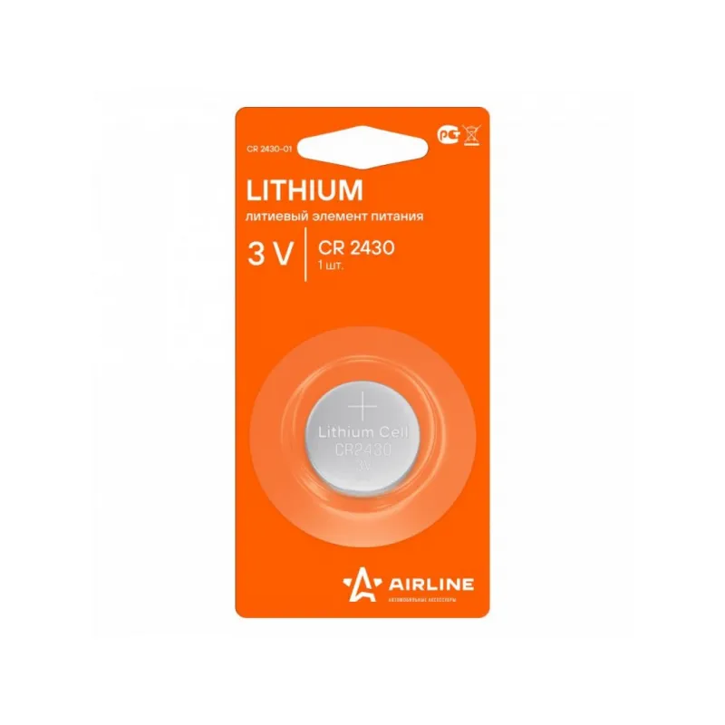 Батарейка CR2430 3V для брелоков сигнализаций литиевая 1 шт. Описание: Батарейки CR2430 / 3V литиевые 1 шт 3 В для брелоков сигнализаций AIRLINE CR2430-01 - Lithium, литиевый элемент питания. Долговечные батарейки – идеальный источник питания для часто используемых устройств. Эти надежные батарейки гарантируют, что ваши гаджеты будут работать дольше, обеспечивая стабильную и продолжительную работу. Оптимальное решение для тех, кто ценит качество и долговечность. Особенности и преимущества: *Удобная и экономичная упаковка - оптимальное количество для подзарядки устройств. *Высокая емкость батареек, продолжительный срок службы, низкий уровень саморазряда. *Электрическая емкость выше, чем у алкалиновых бата. *Абсолютная герметичность. *Увеличенный срок службы. При установке соблюдать полярность (+/-). Не устанавливать одновременно заряженные и разряженные элементы, а также элементы различных марок, систем и типов. Батарейки подойдут на устройства: телевизионные пульты, ручные фонарики, манометры, игрушки, часы, детские игрушки, джойстики, компьютерные мышки, фотоаппараты, плееры. Товар официального производителя AIRLINE. Батарейки это нужная вещь в хозяйстве, всегда пригодится. Характеристики: Артикул: CR2430-01 Номинальное напряжение, В: 3 Типоразмер: CR2430 Комплектация: Батарейка в блистере - 1 шт Гарантия: от 1 года.