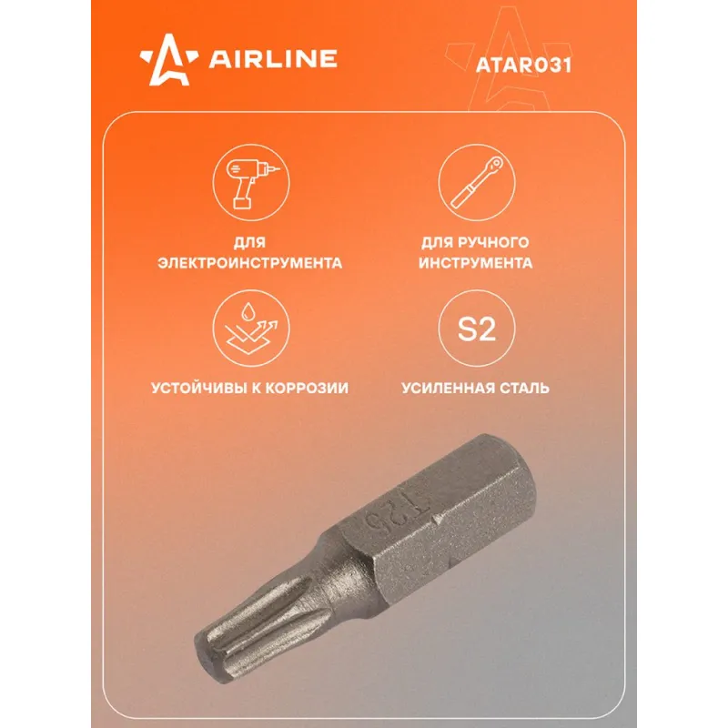 Бита вставка 1/4" TORX T25, 25мм Описание: Набор бит вставок для шуруповерта от бренда AIRLINE ATAR031 - универсальный набор инструментов для работы с резьбовыми соединениями с различным шлицем. Биты вставки изготовлена из специальной стали CR-V, что придаёт им высокую прочность и долговечность. Размер T25; Подходит для работы с шуруповертом, дрелью; Для монтажа, Для сборки, Универсальный; Высокая эффективность при завинчивании или отвинчивании; Разнообразие бит позволит выполнить множество работ в специализированных механических и автосервисах. Набор бит это идеальное дополнение в набор инструментов и подойдет для подарка мужу, дедушке, мужчине, автомобилисту, на день рождения, новый год, 23 февраля и без повода. Характеристики: Артикул: ATAR031 Размер: T25 Длина, мм: 25 Комплектация: Бита - 1 шт Гарантия: от 1 года.