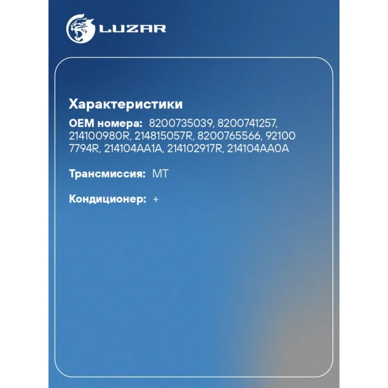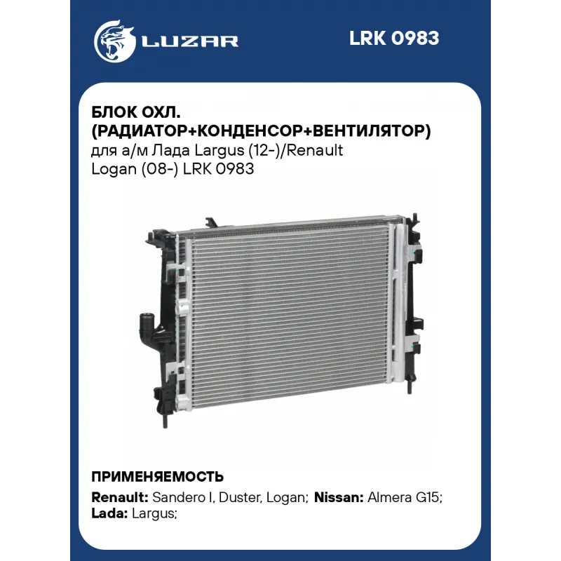 Блок охл. (радиатор+конденсор+вентилятор) для а/м Лада Largus (12-)/Renault Logan (08-) Характеристики: Артикул: LRK 0983 OEM номера: 8200735039, 8200741257, 214100980R, 214815057R, 8200765566, 92100 7794R, 214104AA1A, 214102917R, 214104AA0A Сопутствующий товар: Радиаторы охлаждения: LRc RELo08139 Сопутствующий товар: Радиаторы кондиционера (конденсеры): LRAC 0961 Сопутствующий товар: Электровентиляторы охлаждения: LFc 0966 Сопутствующий товар: Патрубки охлаждения (комплект): LPK 0926, LPK 0927 Количество на автомобиль: 1 Трансмиссия: MT Кондиционер: + Состав:: LRc RELo08139+LRAC 0961+LFc 0966 Подходит для авто: Renault Sandero I (09-), Duster (10-), Logan (08-) Nissan Almera G15 (12-) ВАЗ Largus (12-) Для проверки применяемости отправьте VIN автомобиля через вкладку "Есть вопросы о товаре?" Комплектация: Блок охлаждения в сборе Паспорт изделия Гарантия: от 1 года.