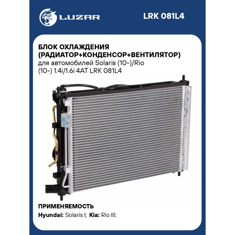 Блок охлаждения (радиатор+конденсор+вентилятор) для автомобилей Solaris (10-)/Rio (10-) 1.4i/1.6i 4AT Характеристики: Артикул: LRK 081L4 OEM номера: 97606-4L000, 97606-1R000, 253801R050, 253804L050, 25310-1R050, 25310-4L050, 25310-4L100 Сопутствующий товар: Патрубки охлаждения (комплект): LPK 08031, LPK 08032, LPK 08033 Количество на автомобиль: 1 Трансмиссия: 4AT Кондиционер: + Сопутствующий товар: Радиаторы охлаждения: LRc 0800; LRc 0801; LRc 0803; LRc 081J1; LRc 081L4; LRc 081P0; LRc 08J1; LRc 08L4 Сопутствующий товар: Радиаторы кондиционера (конденсеры): LRAC 0801; LRAC 08L4 Сопутствующий товар: Электровентиляторы охлаждения: LFK 08L0; LFK 08L4 Состав:: LRc 081L4+LRAC 08L4+LFK 08L4 Подходит для авто: Hyundai Solaris I (10-) Kia Rio III (11-) Для проверки применяемости отправьте VIN автомобиля через вкладку "Есть вопросы о товаре?" Комплектация: Блок охлаждения в сборе Паспорт изделия Гарантия: от 1 года.