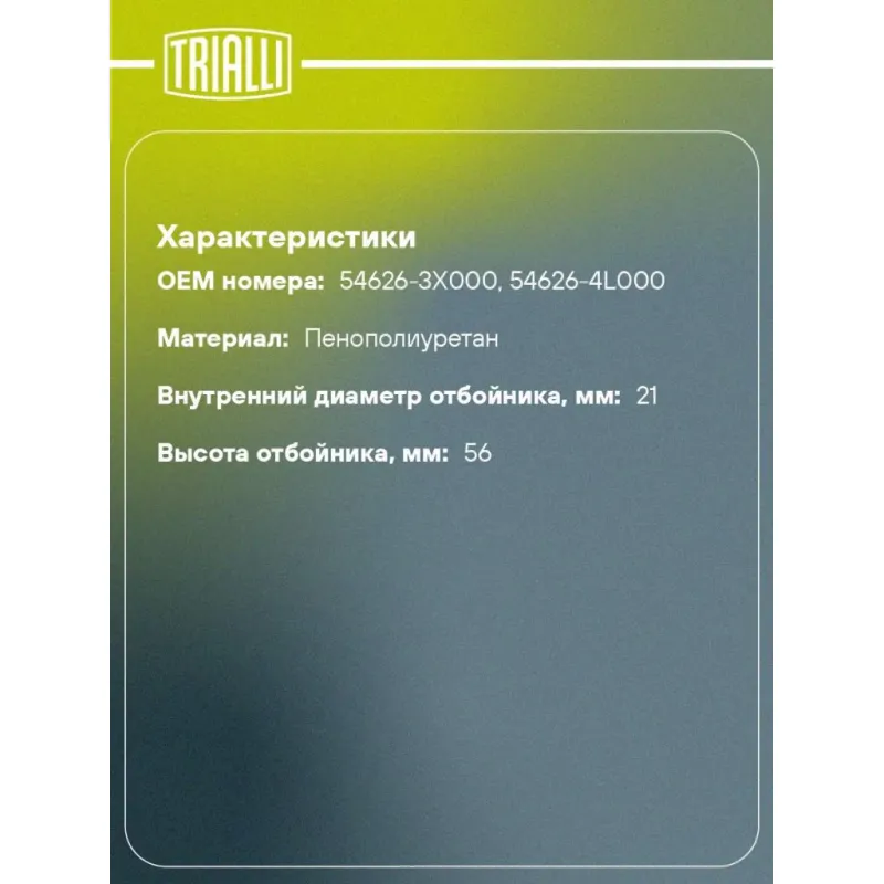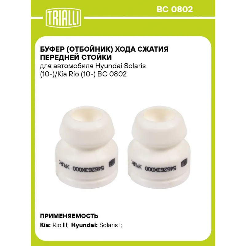 Буфер (отбойник) хода сжатия передней стойки для автомобиля Hyundai Solaris (10-)/Kia Rio (10-) Характеристики: Артикул: BC 0802 OEM номера: 54626-3X000, 54626-4L000 Товарная линейка: BLACK Количество на автомобиль: 1 Материал: Пенополиуретан Внутренний диаметр отбойника, мм: 21 Высота отбойника, мм: 56 Гарантийный срок: 2 года/60 000 км Подходит для авто: Kia Rio III (11-), Rio III (11-) Hyundai Solaris I (10-) Для проверки применяемости отправьте VIN автомобиля через вкладку "Есть вопросы о товаре?" Комплектация: Отбойник (буфер) - 2 шт Гарантия: от 1 года.