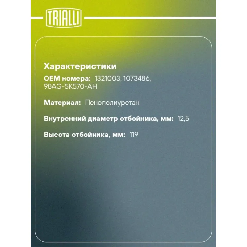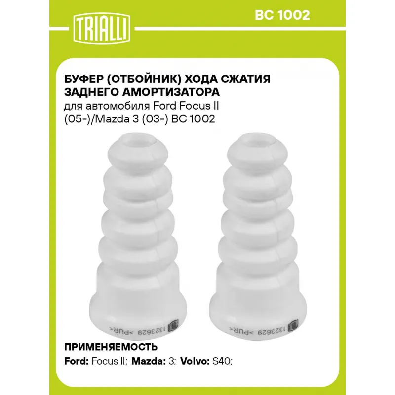Буфер (отбойник) хода сжатия заднего амортизатора для автомобиля Ford Focus II (05-)/Mazda 3 (03-) Характеристики: Артикул: BC 1002 OEM номера: 1321003, 1073486, 98AG-5K570-AH Товарная линейка: BLACK Количество на автомобиль: 1 Материал: Пенополиуретан Внутренний диаметр отбойника, мм: 12,5 Высота отбойника, мм: 119 Гарантийный срок: 2 года/60 000 км Подходит для авто: Ford Focus II (05-) Mazda 3 (03-), 3 (03-) Volvo S40 (04-), S40 (04-) Для проверки применяемости отправьте VIN автомобиля через вкладку "Есть вопросы о товаре?" Комплектация: Отбойник (буфер) - 2 шт Гарантия: от 1 года.