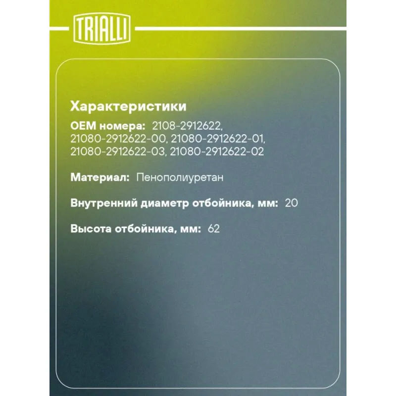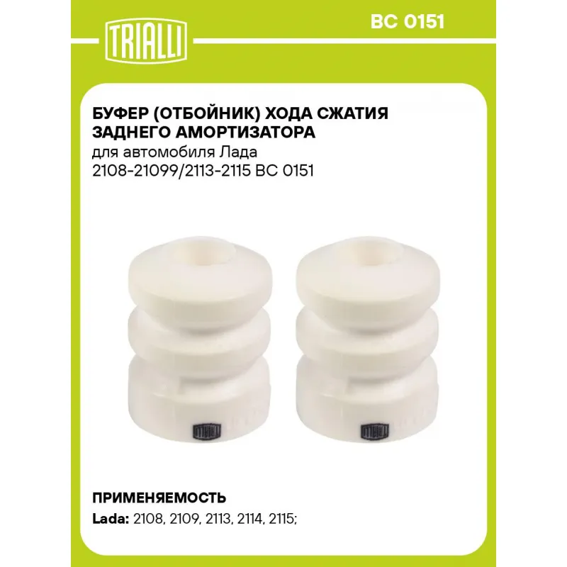 Буфер (отбойник) хода сжатия заднего амортизатора для автомобиля Лада 2108-21099/2113-2115 Характеристики: Артикул: BC 0151 OEM номера: 2108-2912622, 21080-2912622-00, 21080-2912622-01, 21080-2912622-03, 21080-2912622-02 Товарная линейка: BLACK Количество на автомобиль: 1 Материал: Пенополиуретан Внутренний диаметр отбойника, мм: 20 Высота отбойника, мм: 62 Гарантийный срок: 2 года/60 000 км Подходит для авто: ВАЗ 2108, 2108, 2109, 2109, 2113, 2114, 2115, 2108, 2108, 2109, 2109, 2113, 2114, 2115 Для проверки применяемости отправьте VIN автомобиля через вкладку "Есть вопросы о товаре?" Комплектация: Отбойник (буфер) - 2 шт Гарантия: от 1 года.