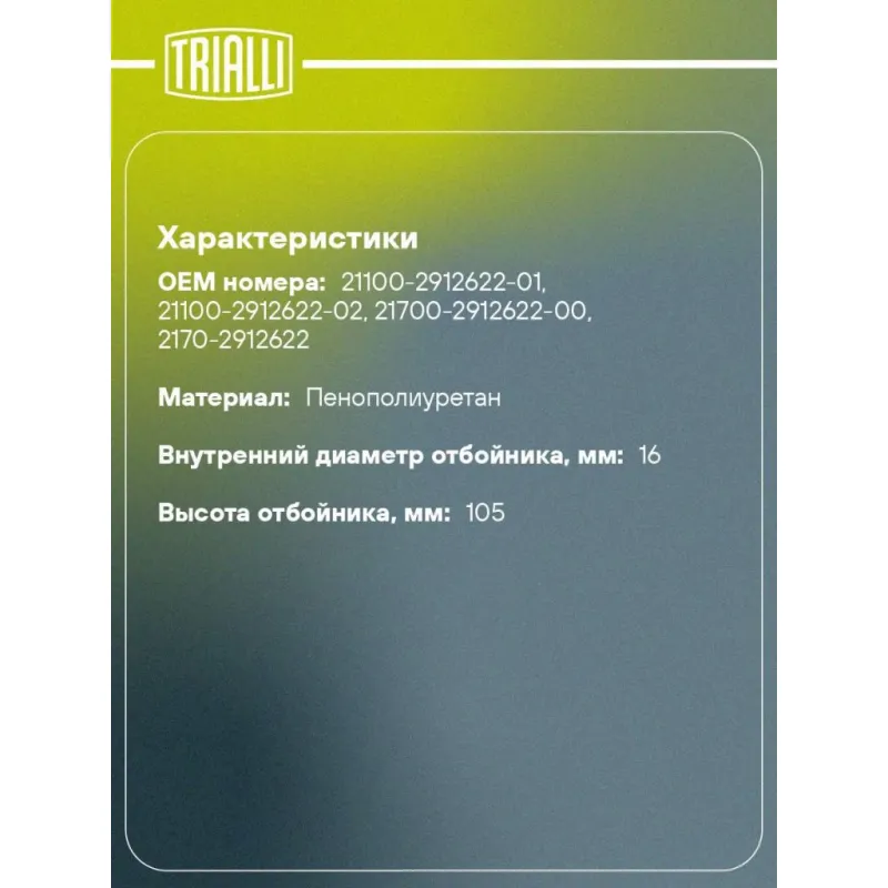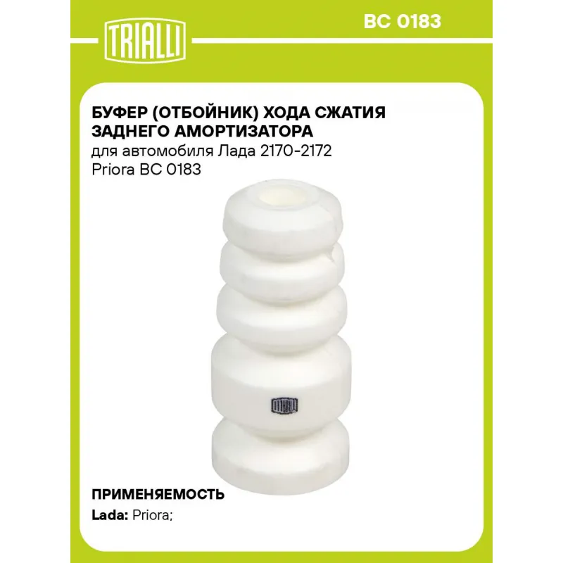 Буфер (отбойник) хода сжатия заднего амортизатора для автомобиля Лада 2170-2172 Priora Характеристики: Артикул: BC 0183 OEM номера: 21100-2912622-01, 21100-2912622-02, 21700-2912622-00, 2170-2912622 Товарная линейка: BLACK Количество на автомобиль: 2 Материал: Пенополиуретан Внутренний диаметр отбойника, мм: 16 Высота отбойника, мм: 105 Гарантийный срок: 2 года/60 000 км Подходит для авто: ВАЗ Priora (07-), Priora (07-), Priora (07-) Для проверки применяемости отправьте VIN автомобиля через вкладку "Есть вопросы о товаре?" Комплектация: Отбойник (буфер) - 1 шт Гарантия: от 1 года.