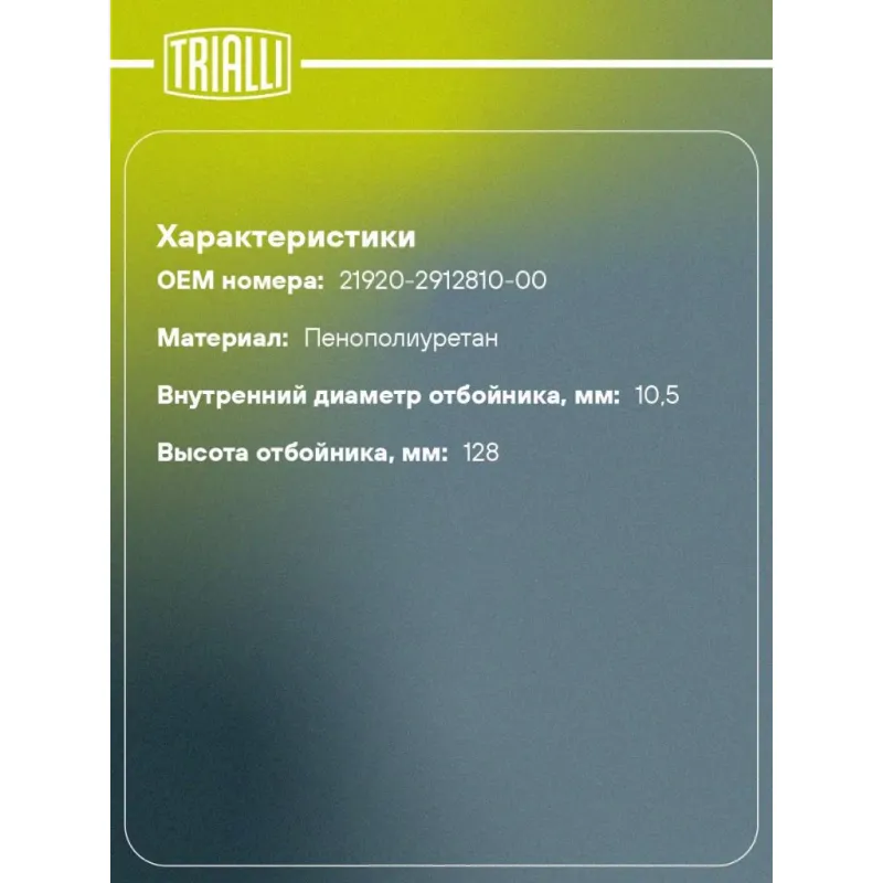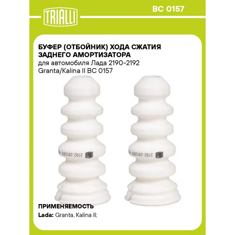Буфер (отбойник) хода сжатия заднего амортизатора для автомобиля Лада 2190-2192 Granta/Kalina II Характеристики: Артикул: BC 0157 OEM номера: 21920-2912810-00 Товарная линейка: BLACK Количество на автомобиль: 1 Материал: Пенополиуретан Внутренний диаметр отбойника, мм: 10,5 Высота отбойника, мм: 128 Гарантийный срок: 2 года/60 000 км Подходит для авто: ВАЗ Granta (10-), Kalina II (13-), Granta (10-) Для проверки применяемости отправьте VIN автомобиля через вкладку "Есть вопросы о товаре?" Комплектация: Отбойник (буфер) - 2 шт Гарантия: от 1 года.