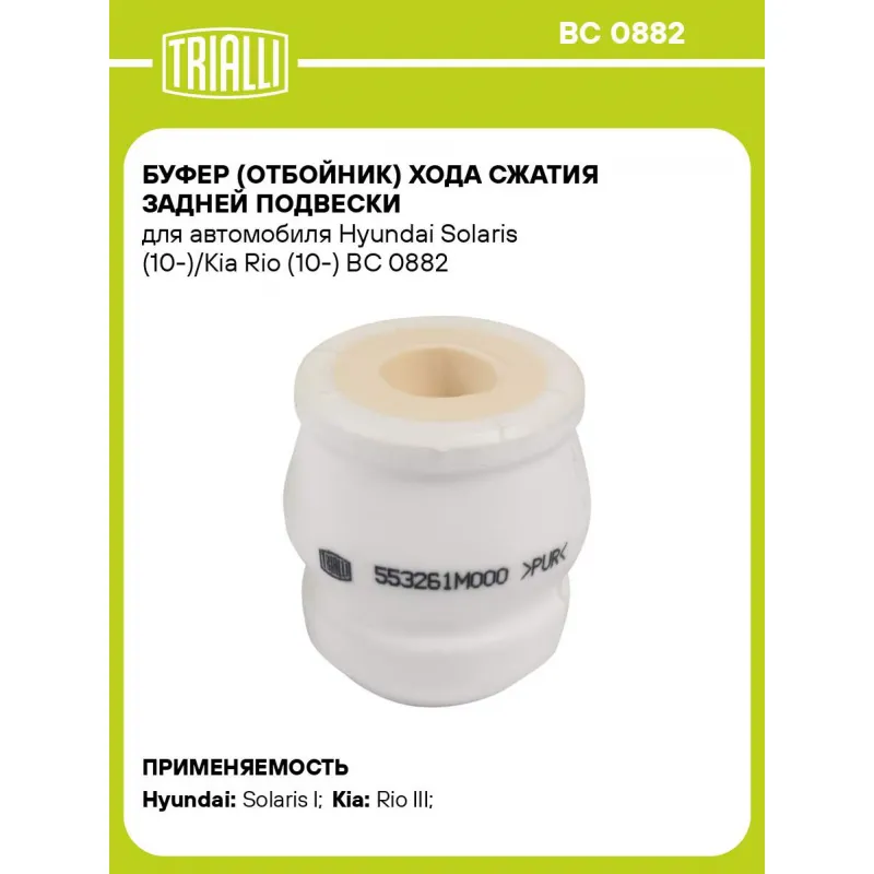 Буфер (отбойник) хода сжатия задней подвески для автомобиля Hyundai Solaris (10-)/Kia Rio (10-) Характеристики: Артикул: BC 0882 OEM номера: 55326-1M000 Товарная линейка: BLACK Количество на автомобиль: 2 Материал: Пенополиуретан Внутренний диаметр отбойника, мм: 23 Высота отбойника, мм: 71.5 Гарантийный срок: 2 года/60 000 км Подходит для авто: Hyundai Solaris I (10-) Kia Rio III (11-), Rio III (11-) Для проверки применяемости отправьте VIN автомобиля через вкладку "Есть вопросы о товаре?" Комплектация: Отбойник (буфер) - 1 шт Гарантия: от 1 года.