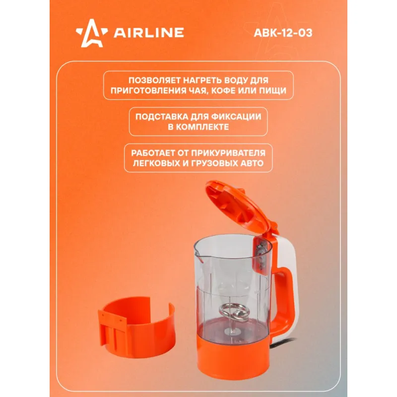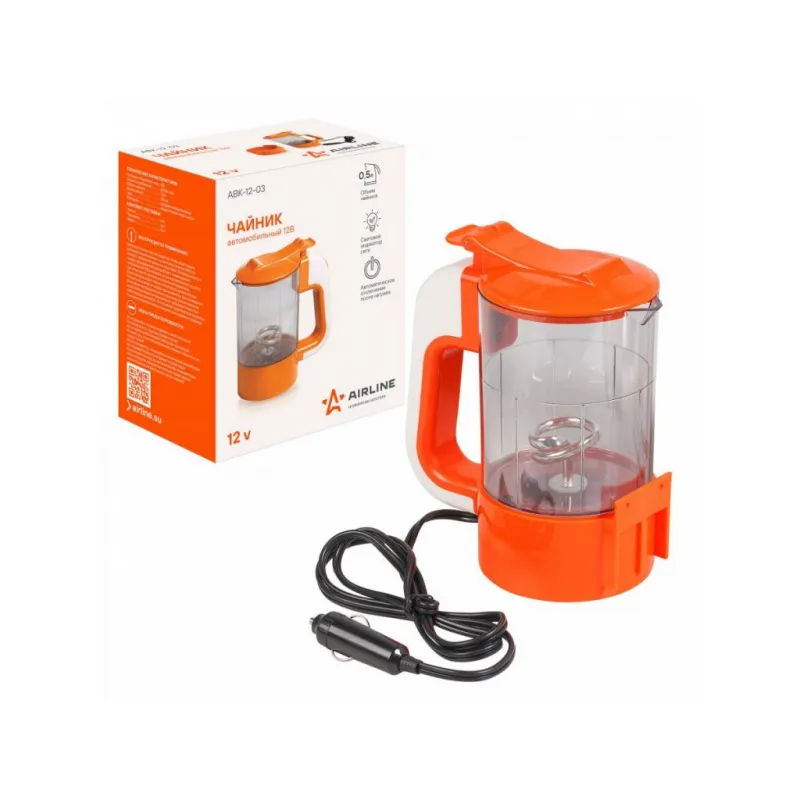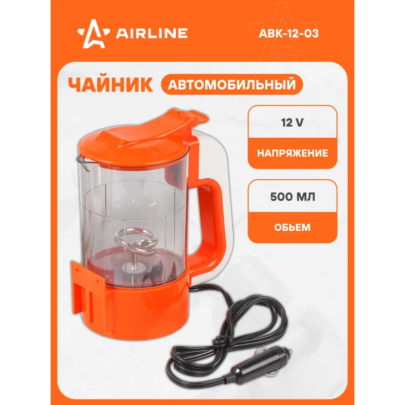 Чайник автомобильный 12В прозрачный/оранжевый пластик Описание: Автомобильный электрический чайник 12В, 500 мл AIRLINE позволяет нагреть воду для приготовления чая, кофе или приготовления пищи. Идеально подходит для длительных поездок на отдых или в командировку на автомобиле. Благодаря специальной подставке прибор просто и надежно фиксируется в любом удобном для водителя и пассажиров месте. Характеристики: Артикул: ABK-12-03 Объем, л: 0,5 Автоматическое выключение: да Максимальная температура нагрева, С: 95 Время нагрева с 23С до 60С, мин: 10 Мощность, Вт: 150 Цвет: серебристый Напряжение питания, В: 12 Длина провода, м: 1,2 Материал колбы: металл Тип термоса: вакуумный Комплектация: Чайник - 1 шт Подставка - 1 шт Шуруп - 2 шт Гарантия: от 1 года.
