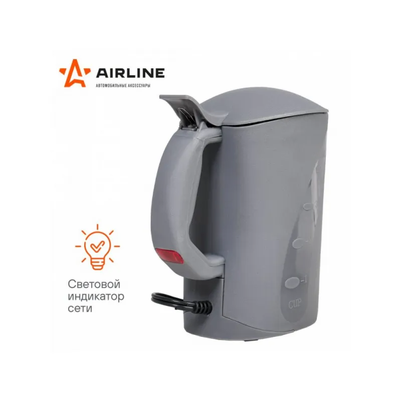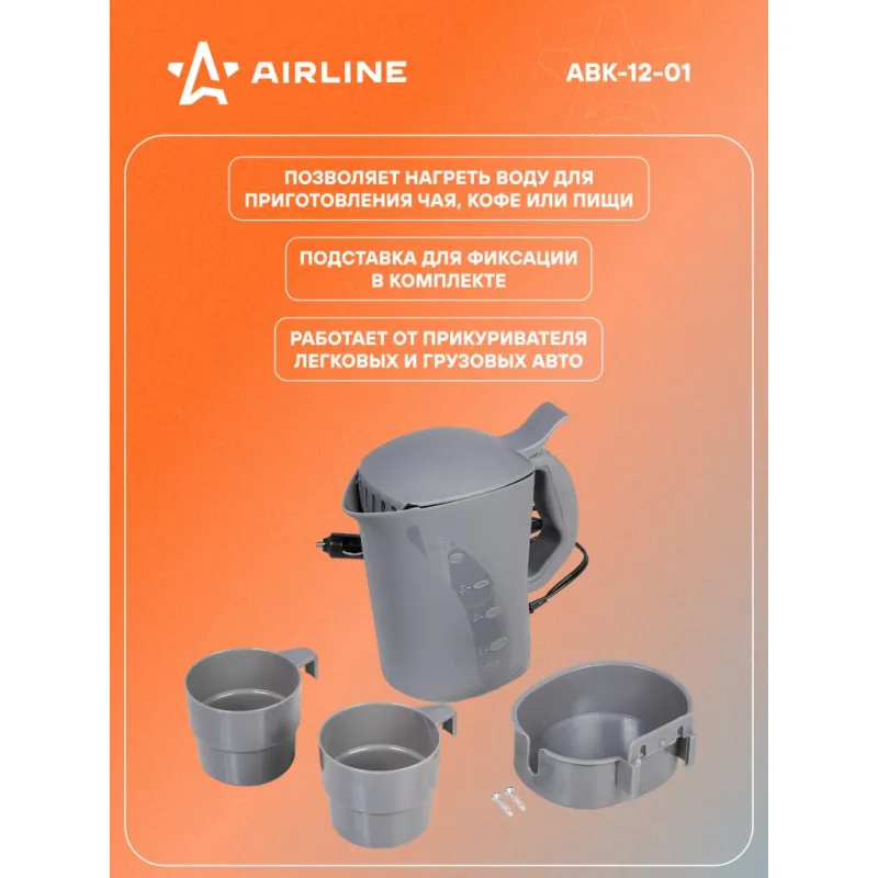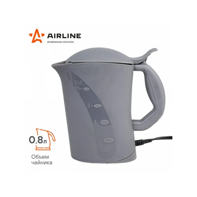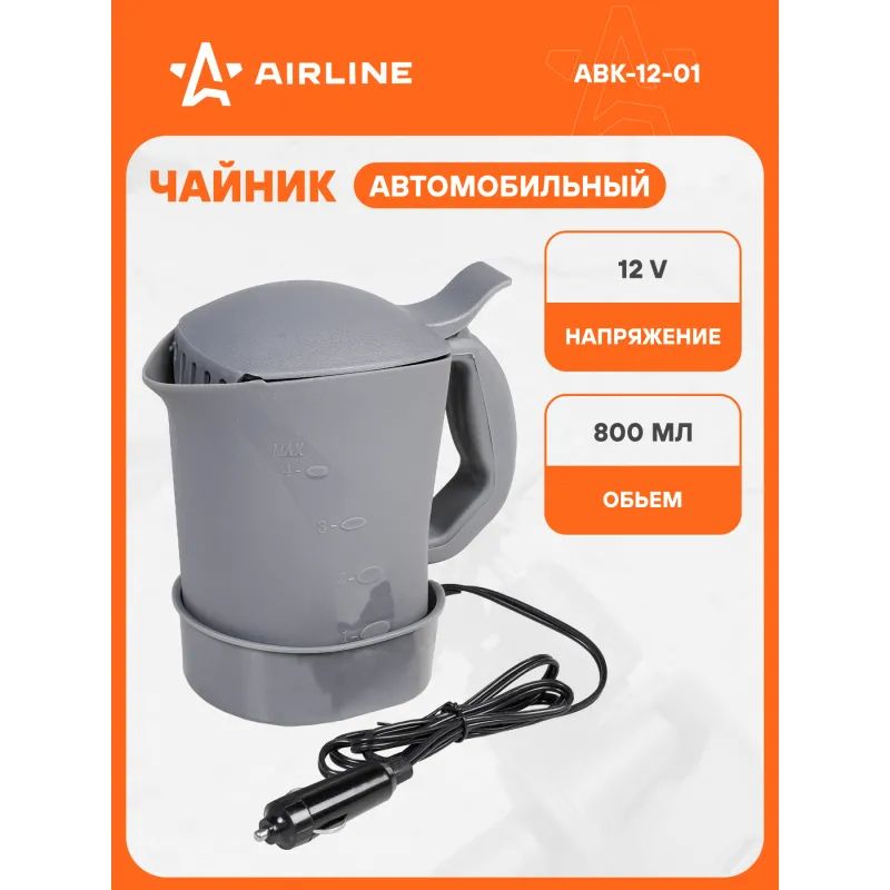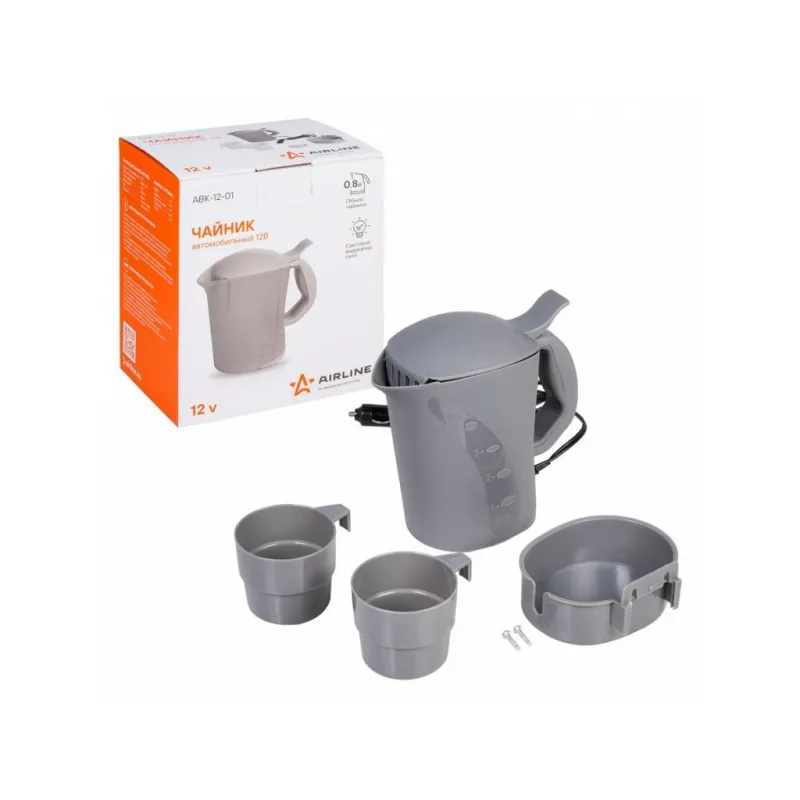 Чайник автомобильный 12В серый пластик Описание: Чайник автомобильный 800 мл, 12В AIRLINE предназначен нагрева воды от прикуривателя легкого и грузового автомобиля. Автомобильный чайник от прикуривателя идеально подходит для длительных поездок. Чайник дорожный электрический позволяет нагреть воду для приготовления чая, кофе или приготовления пищи. Чайник прост в использовании: необходимо вставить штекер чайника в прикуриватель и через пару минут можно насладиться горячим напитком. Благодаря специальной подставке чайник просто и надежно фиксируется в любом удобном для водителя и пассажиров месте. Возьмите с собой автомобильный чайник на пикник, в кемпинг, на рыбалку и в длительную поездку. Характеристики: Артикул: ABK-12-01 Объем, л: 0,8 Автоматическое выключение: нет Максимальная температура нагрева, С: 95 Время нагрева с 23С до 60С, мин: 40 Мощность, Вт: 140 Цвет: серебристый Напряжение питания, В: 12 Длина провода, м: 1,2 Материал колбы: металл Тип термоса: вакуумный Комплектация: Чайник - 1 шт Кружка - 2 шт Фильтр от накипи - 1 шт Подставка - 1 шт Шуруп - 2 шт Гарантия: от 1 года.