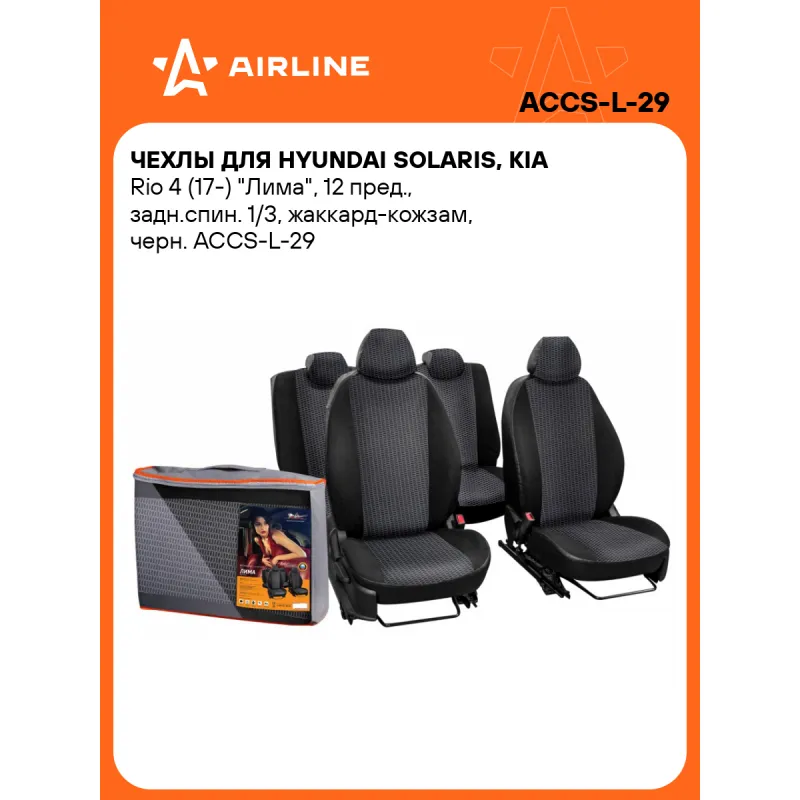Чехлы для Hyundai Solaris, Kia Rio 4 (17-) "Лима", 12 пред., задн.спин. 1/3, жаккард-кожзам, черн. Описание: Чехлы изготовлены по бокам и сзади из искусственной кожи высокого качества черного цвета, в центральной части из автомобильного жаккарда триплированного поролоном, который по своим свойствам идентичен штатному. Жаккардовая вставка имеет рисунок «Штрих» черного цвета с серыми вкраплениями. В местах боковой поддержки применяется специализированная ткань-компаньон. На спинках передних сидений расположены вместительные карманы на молнии. Передние чехлы имеют специальный крой не мешающий открытию подушек безопасности. Характеристики: Артикул: ACCS-L-29 Размер: индивидуальный по марке авто Вид крепления: резинки, крючки, шнуры, липучки Морозостойкость, С: -40 Защита: от механических повреждений, УФ лучей Подходит для авто: Hyundai Solaris II (17-) Kia Rio IV (17-), Rio IV (17-) Для проверки применяемости отправьте VIN автомобиля через вкладку "Есть вопросы о товаре?" Комплектация: Передние спинки - 2 шт Передние сиденья - 2 шт Заднее сиденье - 1 шт Задняя спинка - 2 шт Подголовник - 5 шт Крючки для крепления - 25 шт Гарантия: от 1 года.
