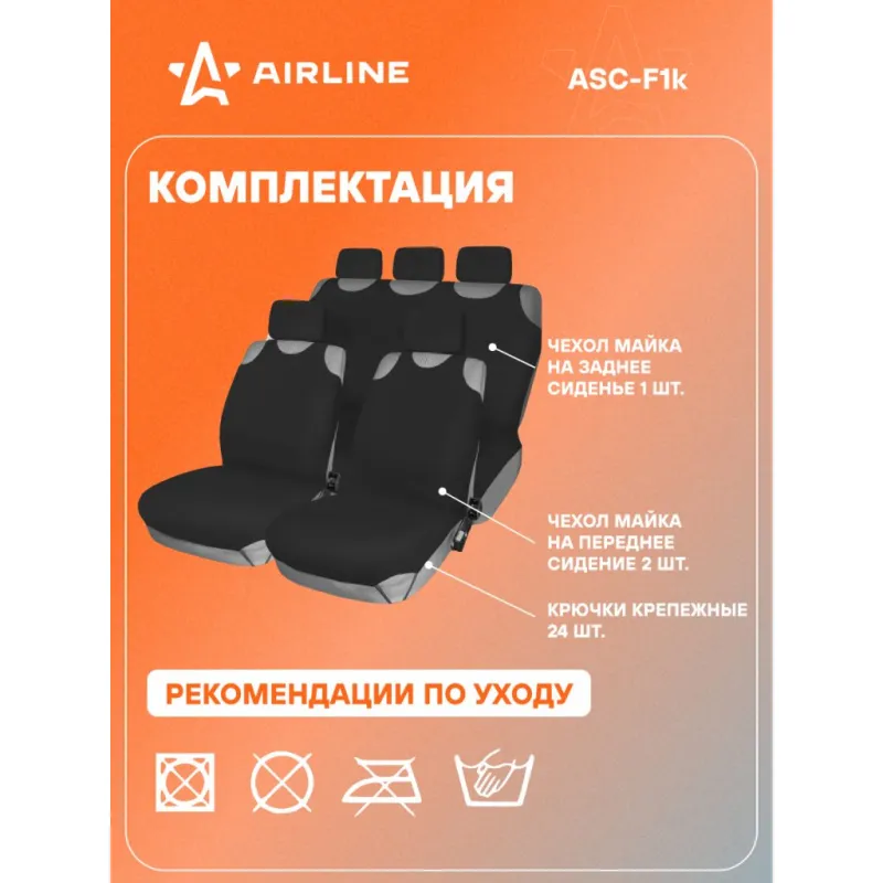 Чехлы-майки F1k компл.передние/задние, цвет черный, полиэстер Описание: Чехлы-майки серии F-1K – это полный комплект чехлов, предназначенный для переднего и заднего ряда автомобильных сидений. Изделия изготовлены в универсальном черном цвете и имеют доступную систему крепления, которая позволит установить чехлы в машину за несколько минут. Чехлы защитят обшивку сидений и помогут надолго сохранить первоначальный вид автомобильного салона. Характеристики: Артикул: ASC-F1k Спинка заднего сиденья, %: 100 Количество молний на спинке заднего чехла, шт: 0 Тип ткани: гладкий полиэстер Количество предметов, шт: 8 Цвет: черный Размер: универсальный Вид крепления: резинки+крючки Карманы на спинках перед. сидений: нет Тип крепления: резинки+крючки Комплектация: Чехлы-майки передние - 2 шт Чехол на заднее сиденье - 1 шт Чехлы на подголовники - 5 шт Крючки для крепления - 24 шт Сумка ПВХ с вкладышем - 1 шт Гарантия: от 1 года.