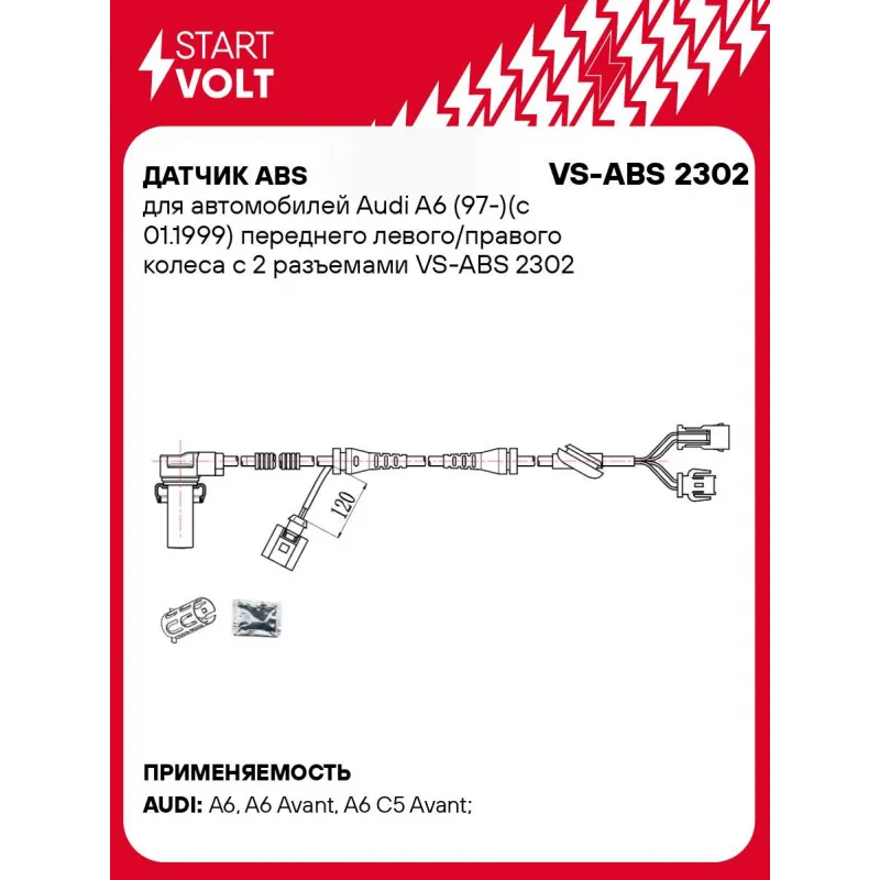 Датчик ABS для автомобилей Audi A6 (97-)(с 01.1999) переднего левого/правого колеса с 2 разъемами Характеристики: Артикул: VS-ABS 2302 OEM номера: 4B0927803C, 4B0927803A, 0986594007 Длина провода, мм: 960 Сторона установки: Передняя ось Монтажная глубина, мм: 39,5 Тип датчика ABS: Пассивный Комплектация: Паспорт изделия/гарантийный талон - 1 шт Датчик ABS - 1 шт Смазка литиевая многофункциональная STARTVOLT (стик 5г) - 1 шт Установочная втулка - 1 шт Гарантия: от 1 года.
