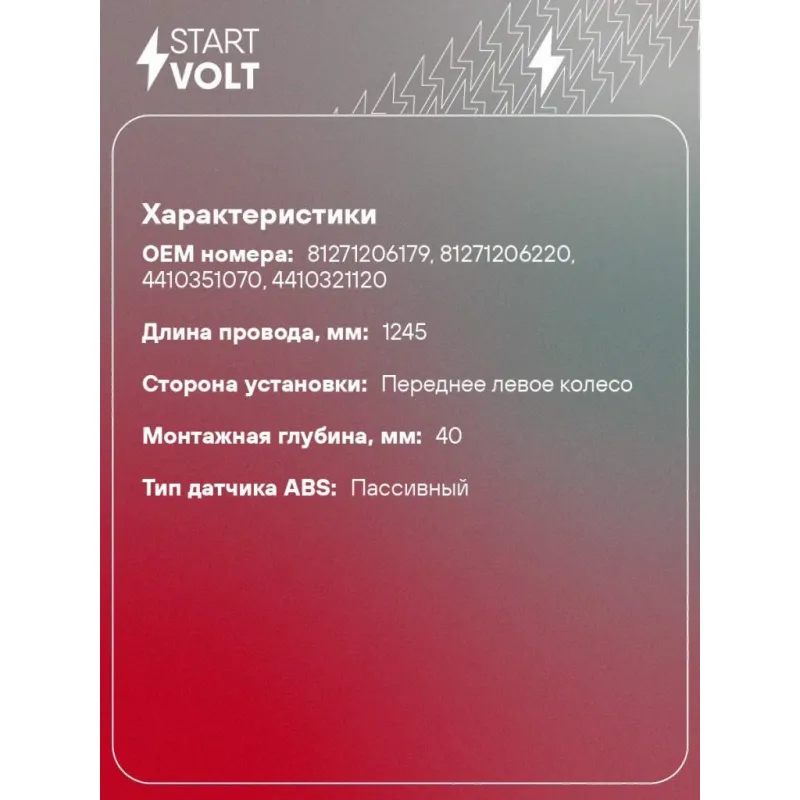 Датчик ABS для автомобилей MAN TGL (04-)/TGM (05-) передний левый Характеристики: Артикул: VS-ABS 2101 OEM номера: 81271206179, 81271206220, 4410351070, 4410321120 Длина провода, мм: 1245 Сторона установки: Переднее левое колесо Монтажная глубина, мм: 40 Тип датчика ABS: Пассивный Подходит для авто: MAN TGL (05-), TGM (05-) ... Читать полностью →