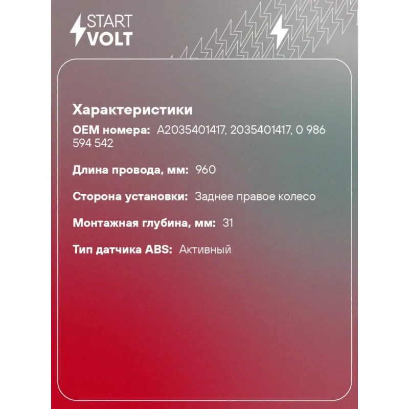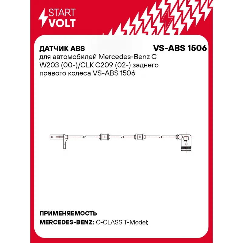 Датчик ABS для автомобилей Mercedes-Benz C W203 (00-)/CLK C209 (02-) заднего правого колеса Характеристики: Артикул: VS-ABS 1506 OEM номера: A2035401417, 2035401417, 0 986 594 542 Длина провода, мм: 960 Сторона установки: Заднее правое колесо Монтажная глубина, мм: 31 Тип датчика ABS: Активный Комплектация: Датчик ABS - 1 шт ... Читать полностью →