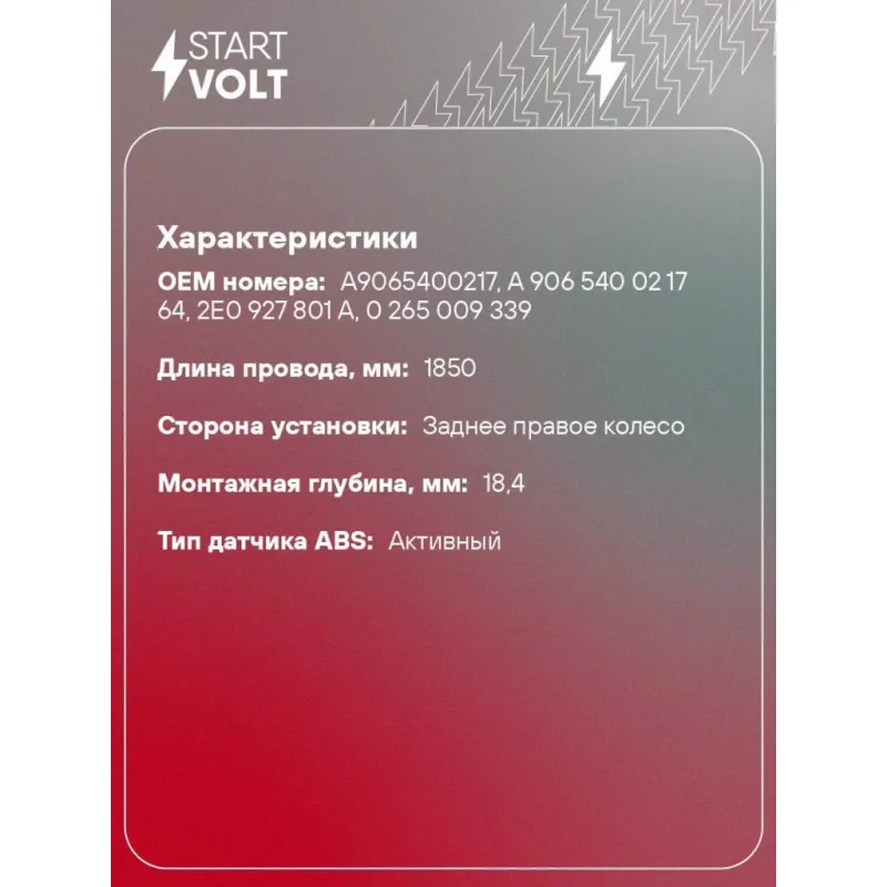 Датчик ABS для автомобилей Mercedes-Benz Sprinter (06-) заднего правого колеса Характеристики: Артикул: VS-ABS 1582 OEM номера: A9065400217, A 906 540 02 17 64, 2E0 927 801 A, 0 265 009 339 Сторона установки: Заднее правое колесо Длина провода, мм: 1850 Тип датчика ABS: Активный Монтажная глубина, мм: 18.4 Подходит для авто: Mercedes-Benz Sprinter (06-) Для проверки применяемости отправьте VIN автомобиля через вкладку "Есть вопросы о товаре?" Комплектация: Датчик ABS - 1 шт Паспорт изделия/гарантийный талон - 1 шт Гарантия: от 1 года.