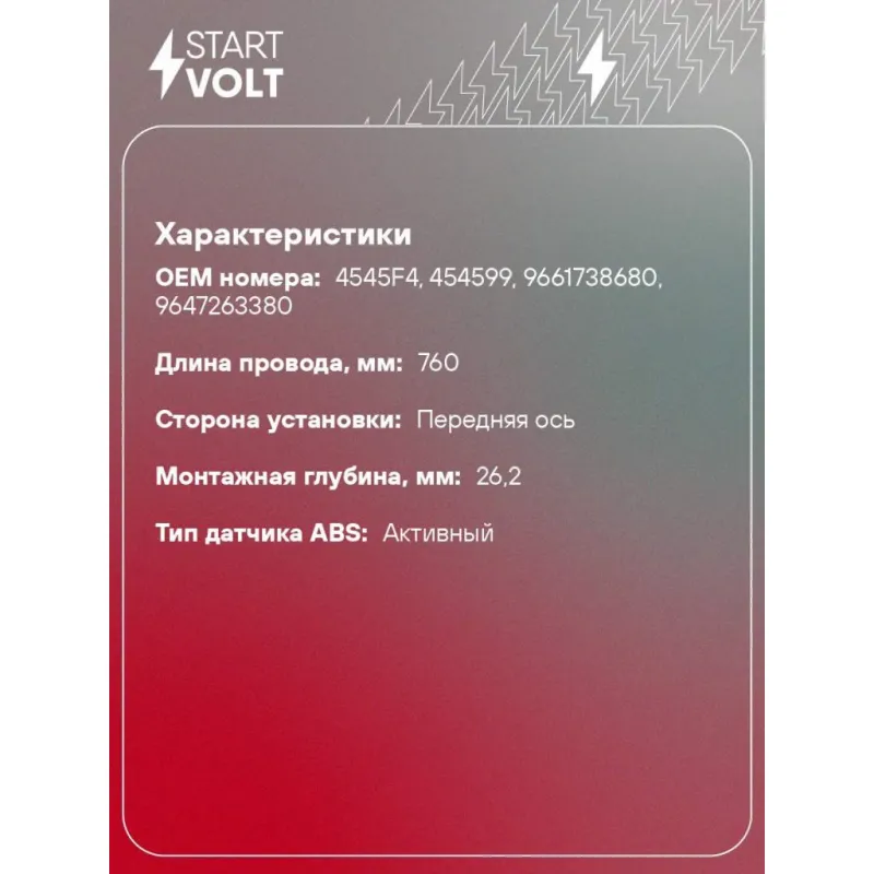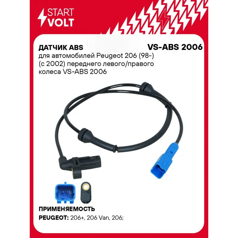 Датчик ABS для автомобилей Peugeot 206 (98-) (с 2002) переднего левого/правого колеса Характеристики: Артикул: VS-ABS 2006 OEM номера: 4545F4, 454599, 9661738680, 9647263380 Длина провода, мм: 760 Сторона установки: Передняя ось Монтажная глубина, мм: 26,2 Тип датчика ABS: Активный Комплектация: Датчик ABS - 1 шт Паспорт изде... Читать полностью →