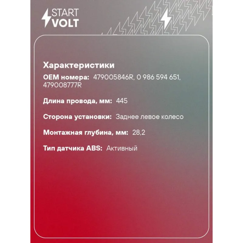 Датчик ABS для автомобилей Renault Logan (12-)/Sandero (14-) заднего левого колеса Характеристики: Артикул: VS-ABS 0905 OEM номера: 479005846R, 0 986 594 651, 479008777R Сторона установки: Заднее левое колесо Длина провода, мм: 445 Тип датчика ABS: Активный Монтажная глубина, мм: 28.2 Подходит для авто: Renault Logan II (12-), Sandero II (14-) Для проверки применяемости отправьте VIN автомобиля через вкладку "Есть вопросы о товаре?" Комплектация: Датчик ABS - 1 шт Паспорт изделия/гарантийный талон - 1 шт Гарантия: от 1 года.