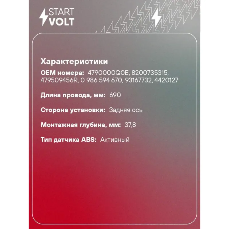 Датчик ABS для автомобилей Renault Master (10-) заднего левого/правого колеса Характеристики: Артикул: VS-ABS 0914 OEM номера: 4790000Q0E, 8200735315, 479509456R, 0 986 594 670, 93167732, 4420127 Длина провода, мм: 690 Сторона установки: Задняя ось Монтажная глубина, мм: 37,8 Тип датчика ABS: Активный Подходит для авто: Iveco... Читать полностью →