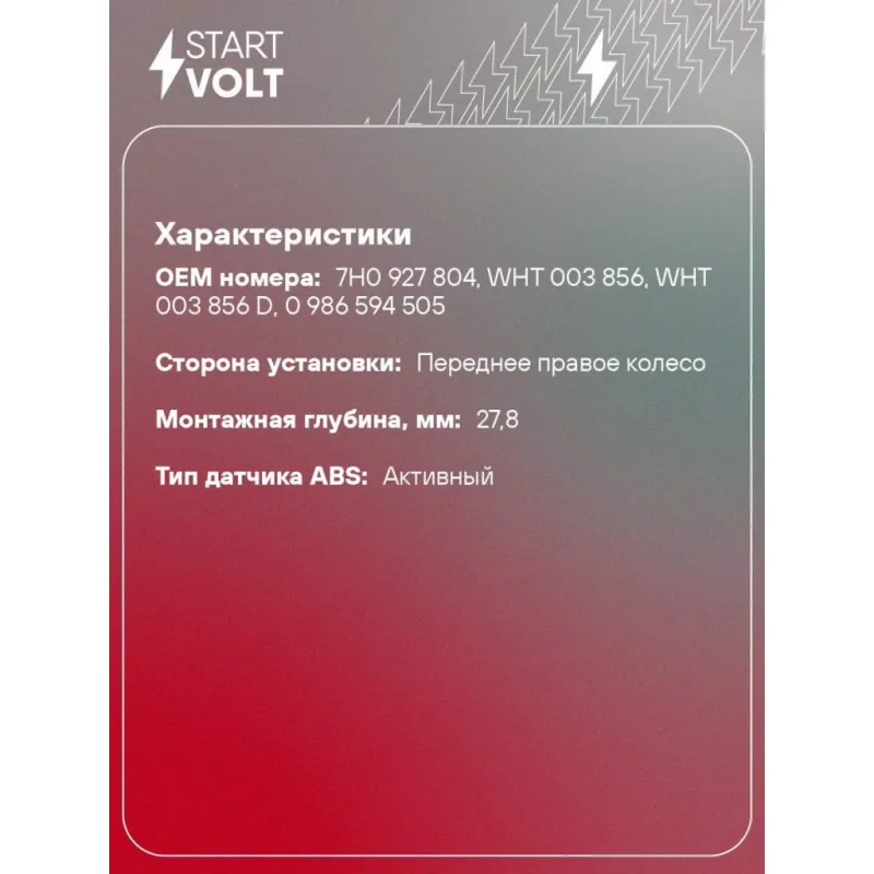 Датчик ABS для автомобилей VAG Passat B6 (05-)/Transporter T5 (03-) переднего правого колеса Характеристики: Артикул: VS-ABS 1809 OEM номера: 7H0 927 804, WHT 003 856, WHT 003 856 D, 0 986 594 505 Сторона установки: Переднее правое колесо Тип датчика ABS: Активный Монтажная глубина, мм: 27.8 Подходит для авто: Volkswagen Passat B6 (05-), Passat B6 (05-), Transporter T5 (03-), Passat B6 (05-), Transporter T5 (03-) Skoda Octavia A5 (04-), Octavia A5 (04-) Audi A3 (03-), A3 (03-) Porsche Carrera GT (03-) Для проверки применяемости отправьте VIN автомобиля через вкладку "Есть вопросы о товаре?" Комплектация: Датчик ABS - 1 шт Паспорт изделия/гарантийный талон - 1 шт Гарантия: от 1 года.