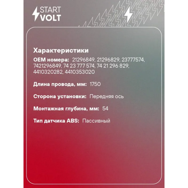 Датчик ABS для автомобилей Volvo FH II (12-) переднего левого/правого колеса Характеристики: Артикул: VS-ABS 3001 OEM номера: 21296849, 21296829, 23777574, 7421296849, 74 23 777 574, 74 21 296 829, 4410320282, 4410353020 Длина провода, мм: 1750 Сторона установки: Передняя ось Монтажная глубина, мм: 54 Тип датчика ABS: Пассивный ... Читать полностью →