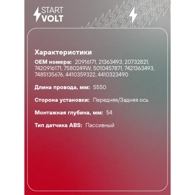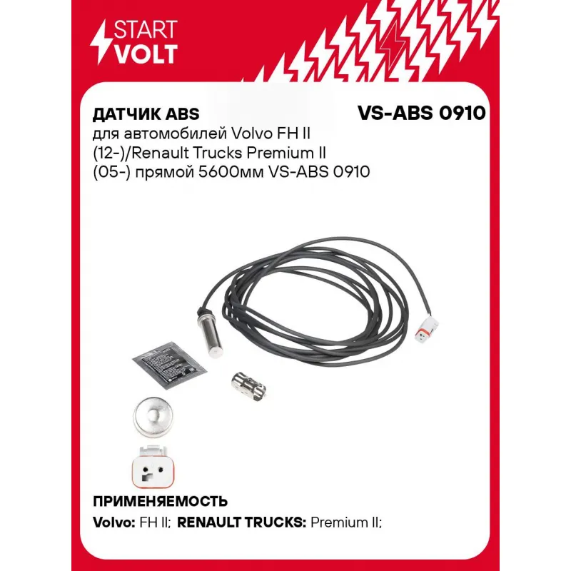 Датчик ABS для автомобилей Volvo FH II (12-)/Renault Trucks Premium II (05-) прямой 5600мм Характеристики: Артикул: VS-ABS 0910 OEM номера: 20916171, 21363493, 20732821, 7420916171, 7580249W, 5010457871, 7421363493, 7485135676, 4410359322, 4410323490 Длина провода, мм: 5550 Сторона установки: Передняя/Задняя ось Монтажная глубина, мм: 54 Тип датчика ABS: Пассивный Подходит для авто: Volvo FH II (12-) RENAULT TRUCKS Premium II (05-) Для проверки применяемости отправьте VIN автомобиля через вкладку "Есть вопросы о товаре?" Комплектация: Паспорт изделия/гарантийный талон - 1 шт Датчик ABS - 1 шт Смазка литиевая многофункциональная STARTVOLT (стик 5г) - 1 шт Установочная втулка - 1 шт Гарантия: от 1 года.