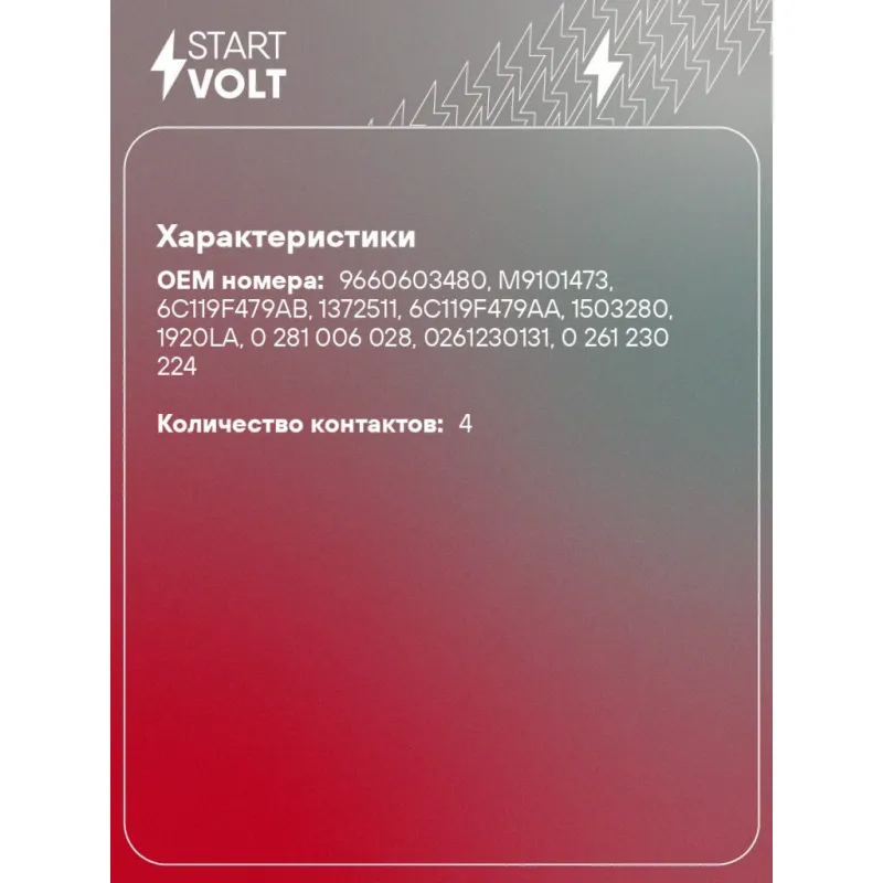 Датчик абсолютного давления для автомобилей Ford Transit (06-) 2.2TDCi/2.4TDCi/Peugeot Boxer (06-)/Citroen Jumper (06-) 2.2HDi Характеристики: Артикул: VS-MP 1003 OEM номера: 9660603480, M9101473, 6C119F479AB, 1372511, 6C119F479AA, 1503280, 1920LA, 0 281 006 028, 0261230131, 0 261 230 224 Количество контактов: 4 Количество на автомобиль: 1 Подходит для авто: Citroen Jumper (06-) Peugeot Boxer (06-) Ford Transit VII (06-) Fiat Ducato III (06-) Для проверки применяемости отправьте VIN автомобиля через вкладку "Есть вопросы о товаре?" Комплектация: Датчик абсолютного давления - 1 шт Паспорт изделия/гарантийный талон - 1 шт Гарантия: от 1 года.