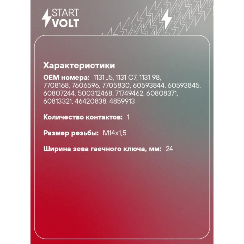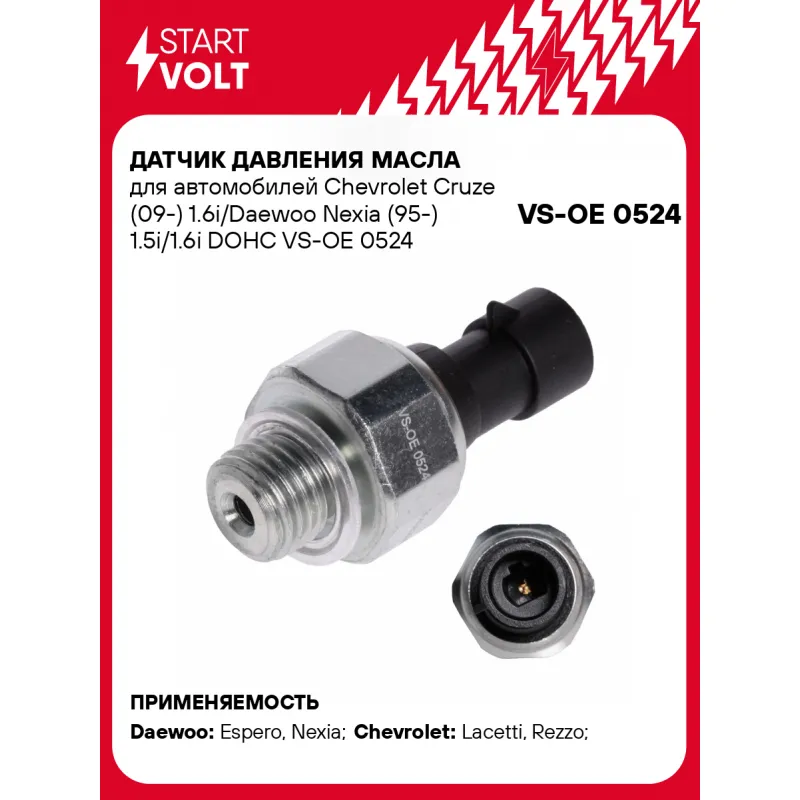 Датчик давления масла для автомобилей Chevrolet Cruze (09-) 1.6i/Daewoo Nexia (95-) 1.5i/1.6i DOHC Характеристики: Артикул: VS-OE 0524 OEM номера: 1131 J5, 1131 C7, 1131 98, 7708168, 7606596, 7705830, 60593844, 60593845, 60807244, 500312468, 71749462, 60808371, 60813321, 46420838, 4859913, 4859914, 50008757, 9S51-9278-AA, 1535416, 37820N86J00, 37820-86J00-000, 16582-85E00-000, 16582-79J50-000, 96494264, 90336039, 95961350, 96281689, 90507539, 55 354 378, 01 252 562, 04 817 876, 01 252 570, 01 252 572, 04 803 551, 01 252 557, 1684718580, 90 33 603, 55202374, 93177490, 93193582, 25180905, 090569684, 055354378, 090507539, 090336039, 90 50 753, 96647339, 9544610, 90335039, 30563311, 93362638, 55 35 437, 4770186, 12 52 572, 90 569 684, 12 52 578, 24 591 033, 93 318 082, 12 52 557, 12 52 562, 12 52 570, 48 03 551, 48 17 876, 45 04 585 Напряжение, В: 12 Количество на автомобиль: 1 Подходящий разъем AIRLINE:: AECC023, AECC282 Давление, БАР: 0.4 Размер резьбы: M14x1,5 Ширина зева гаечного ключа, мм: 24 Количество контактов: 1 Подходит для авто: Daewoo Espero (94-), Nexia (94-) Chevrolet Lacetti (02-), Rezzo (00-) Для проверки применяемости отправьте VIN автомобиля через вкладку "Есть вопросы о товаре?" Комплектация: Датчик аварийного давления масла - 1 шт Паспорт изделия/гарантийный талон - 1 шт Гарантия: от 1 года.