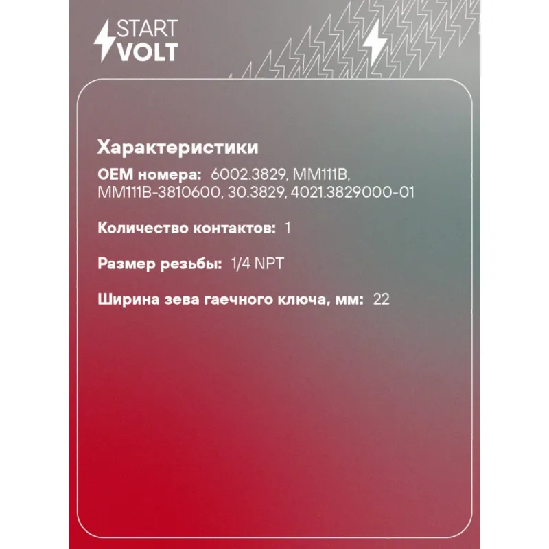 Датчик давления масла для автомобилей ГАЗ/УАЗ с дв. ЗМЗ-402/406/УМЗ-4215/4216/4175 Характеристики: Артикул: VS-OE 0340 OEM номера: 6002.3829, ММ111В, ММ111В-3810600, 30.3829, 4021.3829000-01 Напряжение, В: 12 Количество на автомобиль: 1 Давление, БАР: 0.5 Размер резьбы: 1/4 NPT Ширина зева гаечного ключа, мм: 22 Количество контактов: 1 Подходит для авто: ГАЗ 3110, 31105, 3302, 3302, 2217, 2217, 2752, 2752, 2705, 2705, 3221, 3221, 3102, 3111, 3110, 31105, 3102 УАЗ 23602 Cargo (08-), 23632 Pickup (08-), 3160 (97-), 3162 (00-), 3162 (00-), 3163 (Patriot) (05-), 315195 Для проверки применяемости отправьте VIN автомобиля через вкладку "Есть вопросы о товаре?" Комплектация: Паспорт изделия/гарантийный талон - 1 шт Датчик аварийного давления масла - 1 шт Гарантия: от 1 года.