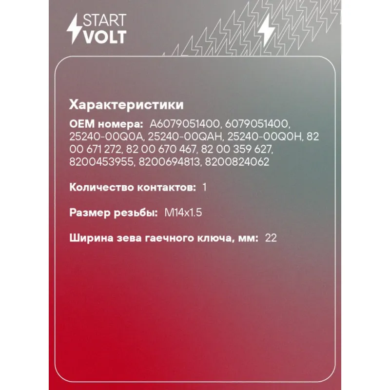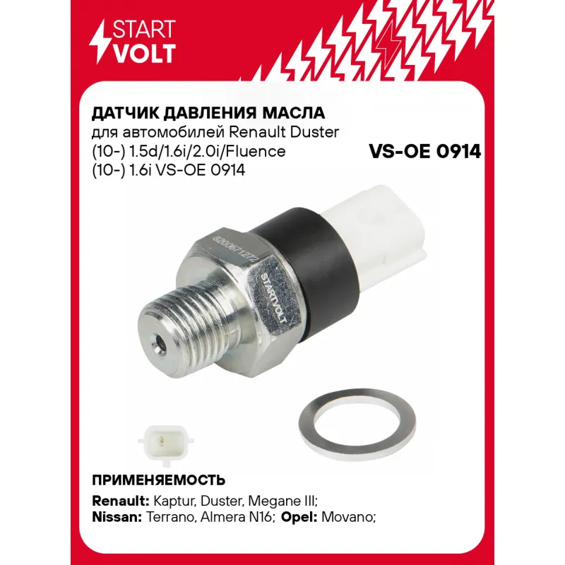 Датчик давления масла для автомобилей Renault Duster (10-) 1.5d/1.6i/2.0i/Fluence (10-) 1.6i Характеристики: Артикул: VS-OE 0914 OEM номера: A6079051400, 6079051400, 25240-00Q0A, 25240-00QAH, 25240-00Q0H, 82 00 671 272, 82 00 670 467, 82 00 359 627, 8200453955, 8200694813, 8200824062, 8200970474, 8200448141, 8200810229, 8200824067, 37820-67J00, 37820-67J01-000, 37820-67J01, 37820-67J00-000, 93 161 662, 93 19 816, 44 31 212, 44 33 805, 93 16 166, 93198166 Напряжение, В: 12 Количество на автомобиль: 1 Давление, БАР: 0,6 Размер резьбы: M14x1.5 Ширина зева гаечного ключа, мм: 22 Количество контактов: 1 Подходит для авто: Renault Kaptur (16-), Duster (10-), Megane III (08-), Clio III (05-) Nissan Terrano (14-), Almera N16 (00-) Opel Movano (98-) Для проверки применяемости отправьте VIN автомобиля через вкладку "Есть вопросы о товаре?" Комплектация: Паспорт изделия/гарантийный талон - 1 шт Кольцо уплотнительное - 1 шт Датчик аварийного давления масла - 1 шт Гарантия: от 1 года.