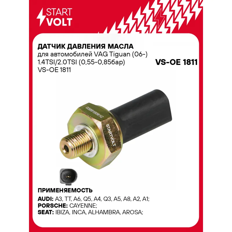 Датчик давления масла для автомобилей VAG Tiguan (06-) 1.4TSI/2.0TSI (0,55-0,85бар) Характеристики: Артикул: VS-OE 1811 OEM номера: 6M219278AA, XM219278BA, 1 461 875, 1M219278AA, 1 206 977, 1 108 808, MN980277, MN980250, 948 606 203 00, 948 606 203 01, 038919081C, 038 919 081 K, 38919081K, 38 919 081 D, 38919081H, 38 919 081, 038 919 081 H, 38 919 081 C, 038 919 081, 038 919 081 D Количество на автомобиль: 1 Давление, БАР: 0,55-0,85 Размер резьбы: M10x1 Ширина зева гаечного ключа, мм: 24 Количество контактов: 1 Напряжение, В: 12 Комплектация: Паспорт изделия/гарантийный талон - 1 шт Кольцо уплотнительное - 1 шт Датчик аварийного давления масла - 1 шт Гарантия: от 1 года.