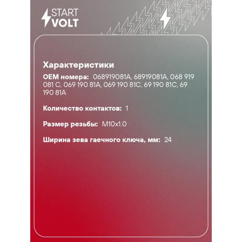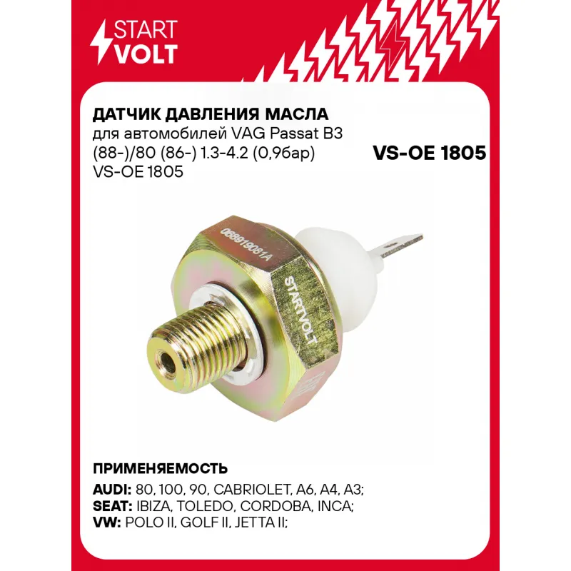 Датчик давления масла для автомобилей VAG Passat B3 (88-)/80 (86-) 1.3-4.2 (0,9бар) Характеристики: Артикул: VS-OE 1805 OEM номера: 068919081A, 68919081A, 068 919 081 C, 069 190 81A, 069 190 81C, 69 190 81C, 69 190 81A Количество контактов: 1 Размер резьбы: M10x1.0 Давление, БАР: 0,9 Напряжение, В: 12 Ширина зева гаечного ключа, мм: 24 Количество на автомобиль: 1 Комплектация: Паспорт изделия/гарантийный талон - 1 шт Датчик аварийного давления масла - 1 шт Кольцо уплотнительное - 1 шт Гарантия: от 1 года.