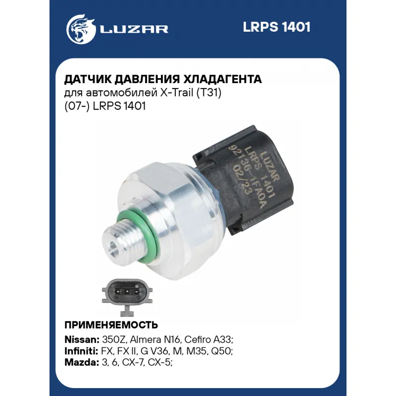 Датчик давления хладагента для автомобилей X-Trail (T31) (07-) Характеристики: Артикул: LRPS 1401 OEM номера: 92136-1FA0A, 92136-6J010, 92136-EL00A, 92136-6J100, 92136-6J000, 92136-3Z600, 92136-ET00A, 92136-ZT00A, 92136-6J001, BBM461503A Размер резьбы: 3/8-24UNF Напряжение, В: 12 Тип резьбы: Внешня резьба Количество на автомобиль: 1 Подходит для авто: Nissan 350Z (02-), Almera N16 (00-), Cefiro A33 (99-), Cube III Z12 (09-), Juke (10-), Maxima A33 (99-), Micra K12 (02-), Murano I (02-), Murano II (08-), Note (06-), NP300 (08-), Pathfinder R51 (05-), Pathfinder R51 (05-), Primera P11 (96-), Primera P12 (02-), Qashqai+2 JJ10 (08-), Teana J32 (08-), Teana L33 (13-), Tiida (04-), Tiida (15-), X-Trail T30 (01-), X-Trail T32 (14-), Almera N16 (00-), Juke (10-), Micra K12 (02-), Murano III (14-), Murano III (14-), Note (06-), Note (14-), Pathfinder R50 (95-), Pathfinder R51 (05-), Primera P11 (96-), Primera P12 (02-), Teana J32 (08-), Tiida (04-), X-Trail T30 (01-), X-Trail T31 (07-) Infiniti FX (02-), FX II (08-), FX II (08-), G V36 (07-), M (10-), M35 (05-), Q50 (13-), Q70 (14-), M45 (05-), QX50 (13-), QX70 (13-) Mazda 3 (BL) (09-), 6 (13-), CX-7 (07-), CX-5 (12-), 3 (13-), CX-7 (07-) Для проверки применяемости отправьте VIN автомобиля через вкладку "Есть вопросы о товаре?" Комплектация: Датчик давления хладагента Гарантия: от 1 года.