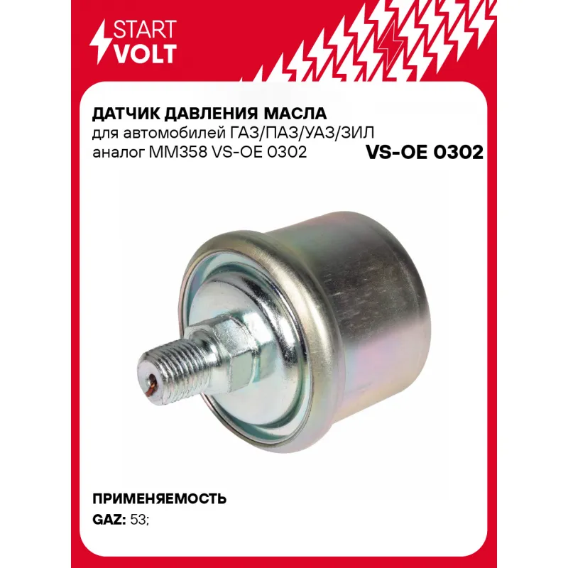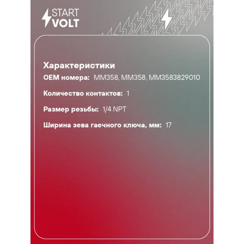 Датчик давления масла для автомобилей ГАЗ/ПАЗ/УАЗ/ЗИЛ аналог ММ358 Характеристики: Артикул: VS-OE 0302 OEM номера: MM358, ММ358, ММ3583829010 Напряжение, В: 12 Количество на автомобиль: 1 Давление, БАР: 0-6 Размер резьбы: 1/4 NPT Ширина зева гаечного ключа, мм: 17 Количество контактов: 1 Подходит для авто: ГАЗ 53, 53 Для проверки применяемости отправьте VIN автомобиля через вкладку "Есть вопросы о товаре?" Комплектация: Паспорт изделия/гарантийный талон - 1 шт Датчик аварийного давления масла - 1 шт Гарантия: от 1 года.
