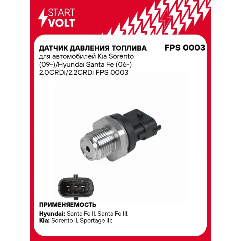 Датчик давления топлива для автомобилей Kia Sorento (09-)/Hyundai Santa Fe (06-) 2.0CRDi/2.2CRDi Характеристики: Артикул: FPS 0003 OEM номера: 31401 2F000, 0281006035 Входное напряжение:: 5 Резьба: M18x1,5 Рабочее давление, бар: 2000 Количество на автомобиль: 1 Подходит для авто: Hyundai Santa Fe II (06-), Santa Fe II (06-), Santa Fe III (12-), iX35 (10-) Kia Sorento II (09-), Sportage III (10-) Для проверки применяемости отправьте VIN автомобиля через вкладку "Есть вопросы о товаре?" Комплектация: Датчик давления топлива - 1 шт Паспорт изделия/гарантийный талон - 1 шт Гарантия: от 1 года.