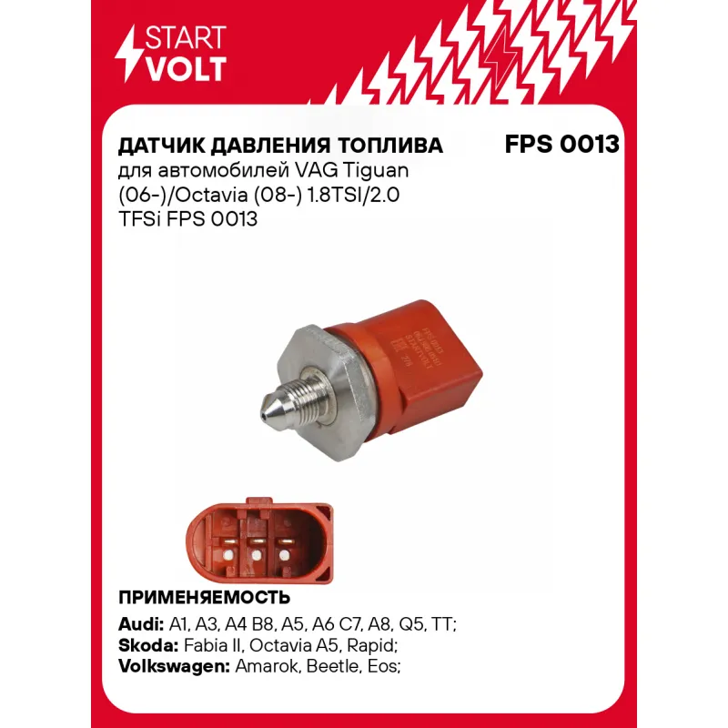 Датчик давления топлива для автомобилей VAG Tiguan (06-)/Octavia (08-) 1.8TSI/2.0 TFSi Характеристики: Артикул: FPS 0013 OEM номера: 06J906051D, 0261545113, 0261545050, 06J 906 054 B Входное напряжение:: 5 Резьба: M10x1 Рабочее давление, бар: 200 Количество на автомобиль: 1 Подходит для авто: Audi A1 (10-), A3 (03-), A4 B8 (07-), A5 (07-), A6 C7 (11-), A8 (10-), Q5 (08-), TT (06-), Q3 (11-), Q5 (08-) Skoda Fabia II (07-), Octavia A5 (04-), Rapid (12-), Roomster (06-), Superb II (08-), Yeti (09-), Octavia A5 (04-), Yeti (09-) Volkswagen Amarok (09-), Beetle (10-), Beetle (10-), Eos (06-), Golf Plus (05-), Golf VI (08-), Jetta (05-), Jetta (11-), Passat CC (08-), Passat CC (08-), Polo V (09-), Scirocco (08-), Sharan (10-), Tiguan (08-), Touareg II (10-), Touran (03-), Transporter T6 (15-), CC (11-), Golf V (03-), Golf VI (08-), Jetta (05-), Passat B7 (10-), Transporter T5 (03-) Seat Altea (07-), Exeo (06-), Ibiza (08-), Leon (05-), Leon (05-), Toledo (04-), Toledo (12-) Bentley Continental GT (11-) Для проверки применяемости отправьте VIN автомобиля через вкладку "Есть вопросы о товаре?" Комплектация: Датчик давления топлива - 1 шт Паспорт изделия/гарантийный талон - 1 шт Гарантия: от 1 года.