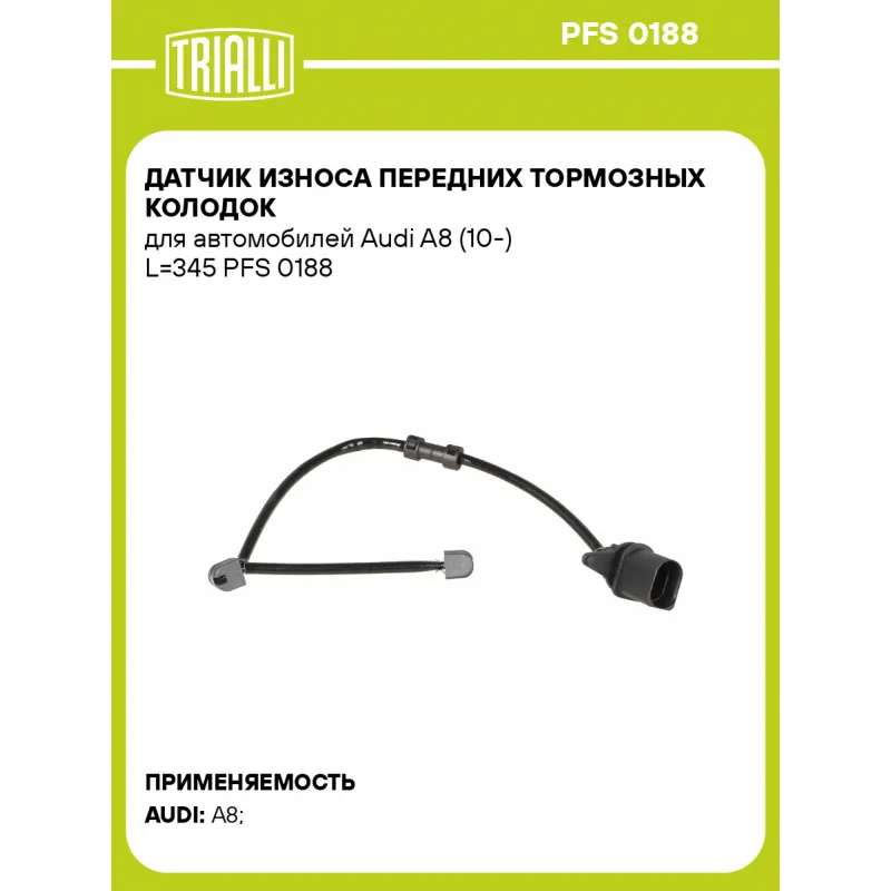 Датчик износа передних тормозных колодок для автомобилей Audi A8 (10-) L=345 Характеристики: Артикул: PFS 0188 OEM номера: 4H0615121M Длина, мм: 345 Сторона установки: Передняя ось Необходимое количество: 2 на ось Количество на автомобиль: 2 Гарантийный срок: 1 год / 30.000 км Товарная линейка: BLACK Комплектация: Датчик изно... Читать полностью →