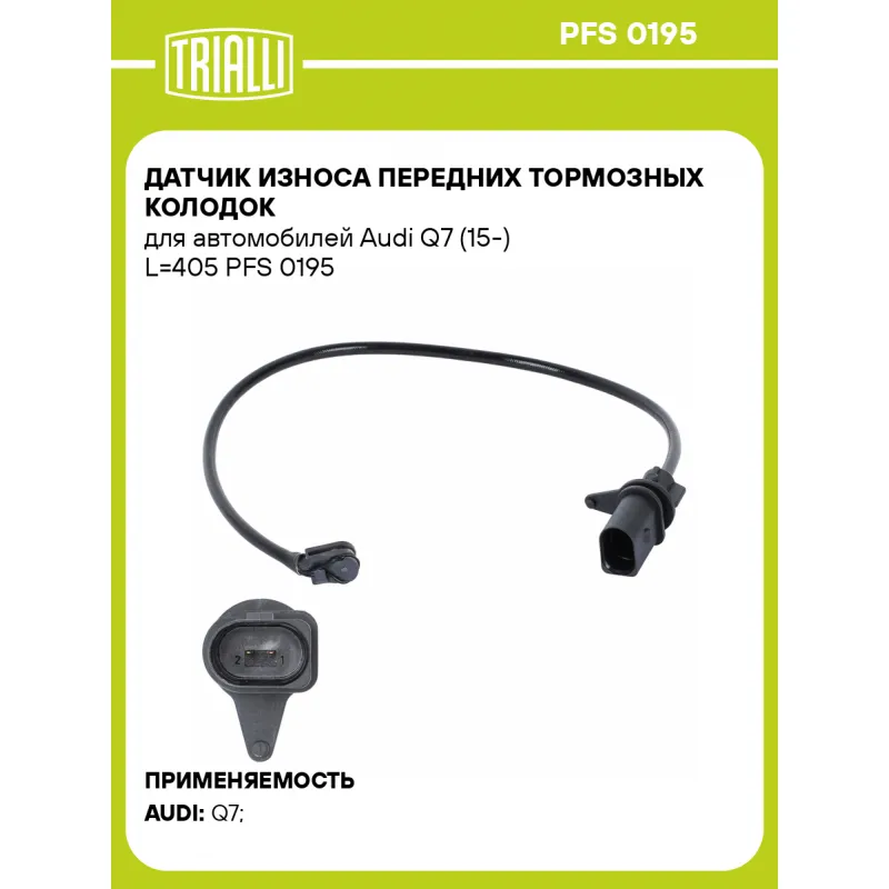 Датчик износа передних тормозных колодок для автомобилей Audi Q7 (15-) L=405 Характеристики: Артикул: PFS 0195 OEM номера: 4M0615121AC, 4M0615121Q, 4M0615121T Длина, мм: 405 Сторона установки: Передняя ось Необходимое количество: 2 на ось Количество на автомобиль: 2 Гарантийный срок: 1 год / 30.000 км Товарная линейка: BLACK К... Читать полностью →