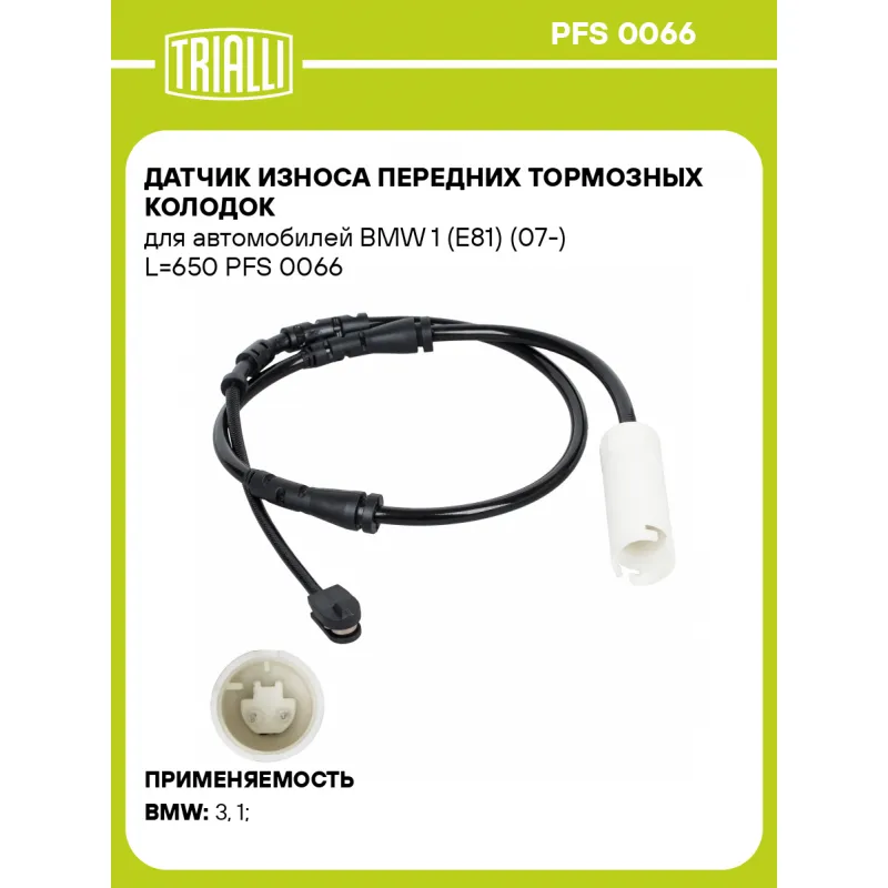 Датчик износа передних тормозных колодок для автомобилей BMW 1 (E81) (07-) L=650 Характеристики: Артикул: PFS 0066 OEM номера: 34 35 6 792 559 Длина, мм: 650 Сторона установки: Передняя ось Необходимое количество: 1 на ось Количество на автомобиль: 1 Гарантийный срок: 1 год / 30.000 км Товарная линейка: BLACK Комплектация: Датчик износа - 1 шт Гарантия: от 1 года.