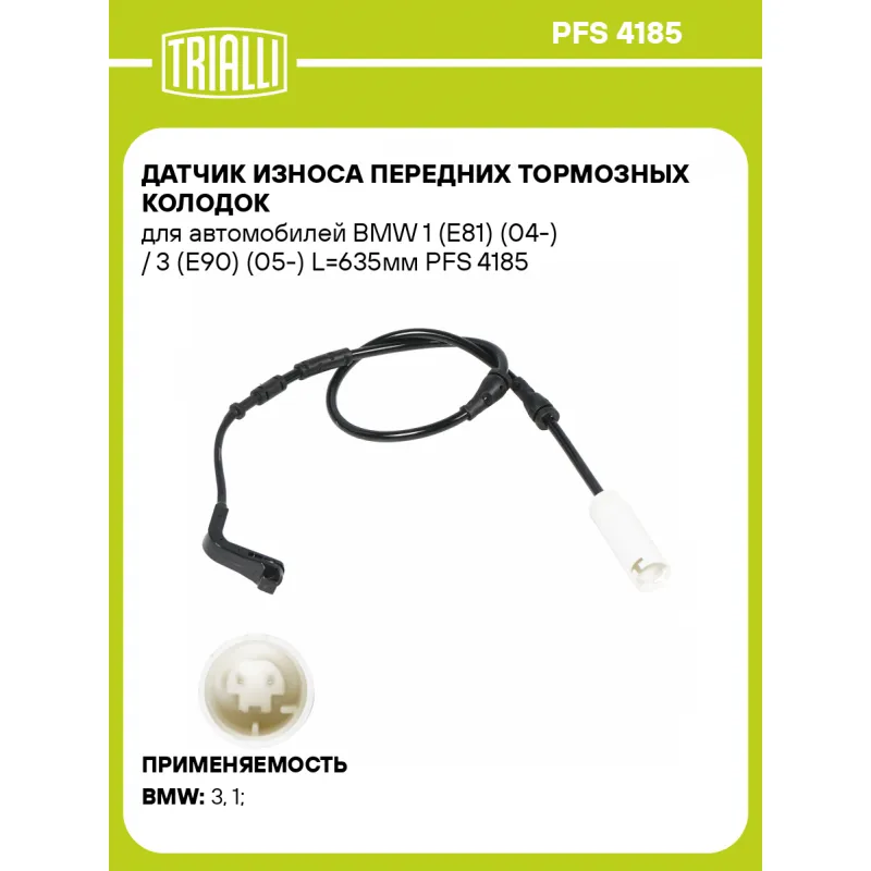 Датчик износа передних тормозных колодок для автомобилей BMW 1 (E81) (04-) / 3 (E90) (05-) L=635мм Характеристики: Артикул: PFS 4185 OEM номера: 34 35 6 762 252, 34 35 6 789 439, 6762252, 6789439 Необходимое количество: 1 на ось Количество на автомобиль: 1 Сопутствующие товары:: PF 4185 Длина, мм: 630 Сторона установки: Передняя... Читать полностью →