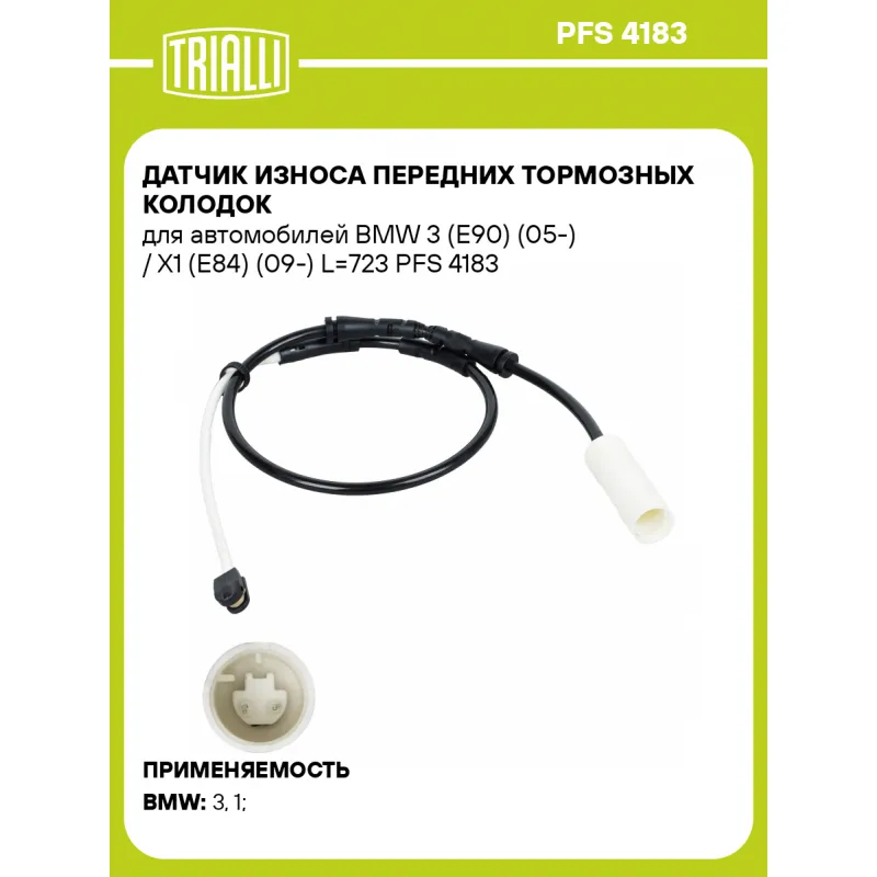 Датчик износа передних тормозных колодок для автомобилей BMW 3 (E90) (05-) / X1 (E84) (09-) L=723 Характеристики: Артикул: PFS 4183 OEM номера: 34356792560 Необходимое количество: 1 на ось Количество на автомобиль: 1 Сопутствующие товары:: PF 4183 Длина, мм: 723 Сторона установки: Передняя ось Гарантийный срок: 1 год / 30 000 км Товарная линейка: BLACK Комплектация: Датчик износа - 1 шт Гарантия: от 1 года.