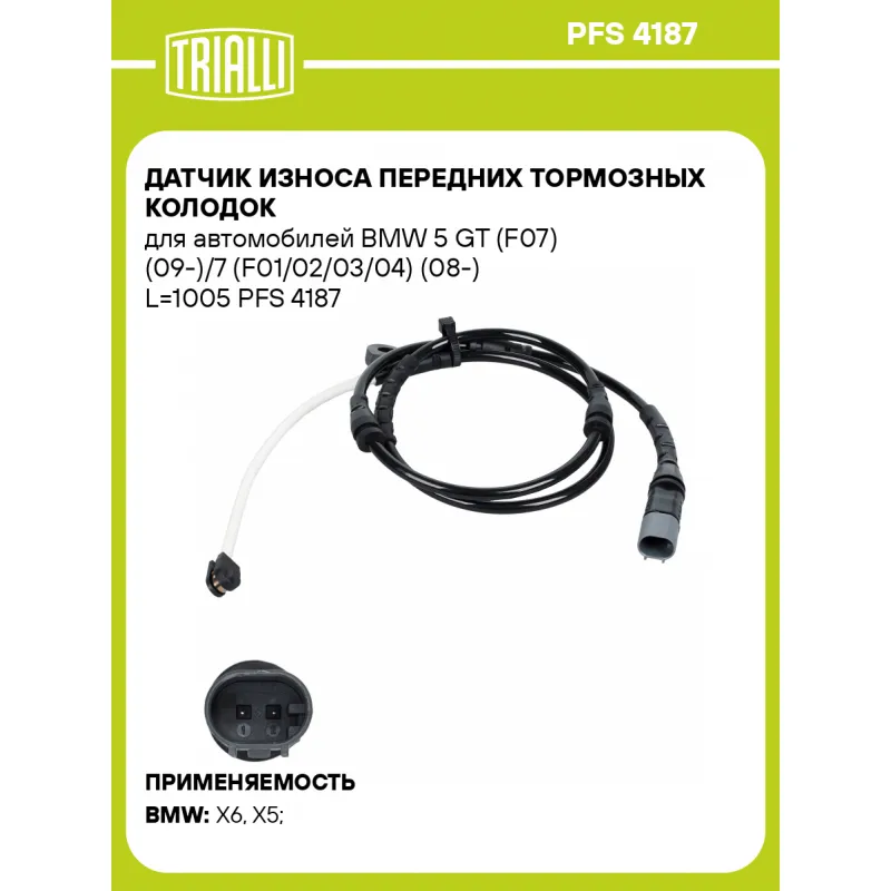 Датчик износа передних тормозных колодок для автомобилей BMW 5 GT (F07) (09-)/7 (F01/02/03/04) (08-) L=1005 Характеристики: Артикул: PFS 4187 OEM номера: 34356792569, 34356860181 Необходимое количество: 1 на ось Количество на автомобиль: 1 Сопутствующие товары:: PF 4187 Длина, мм: 1005 Сторона установки: Передняя ось Гарантийный срок: 1 год / 30 000 км Товарная линейка: BLACK Комплектация: Датчик износа - 1 шт Гарантия: от 1 года.
