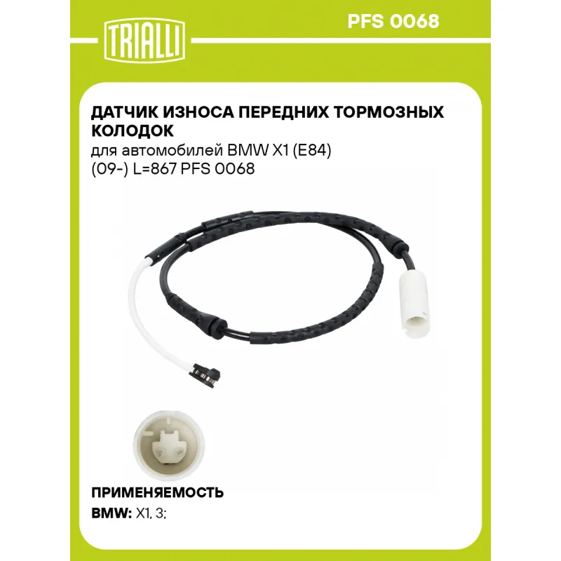 Датчик износа передних тормозных колодок для автомобилей BMW X1 (E84) (09-) L=867 Характеристики: Артикул: PFS 0068 OEM номера: 34356792561 Длина, мм: 867 Сторона установки: Передняя ось Необходимое количество: 1 на ось Количество на автомобиль: 1 Гарантийный срок: 1 год / 30.000 км Товарная линейка: BLACK Комплектация: Датчик износа - 1 шт Гарантия: от 1 года.