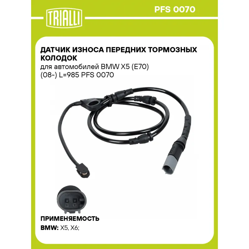 Датчик износа передних тормозных колодок для автомобилей BMW X5 (E70) (08-) L=985 Характеристики: Артикул: PFS 0070 OEM номера: 34356792567 Длина, мм: 985 Сторона установки: Передняя ось Необходимое количество: 1 на ось Количество на автомобиль: 1 Гарантийный срок: 1 год / 30.000 км Товарная линейка: BLACK Комплектация: Датчик износа - 1 шт Гарантия: от 1 года.