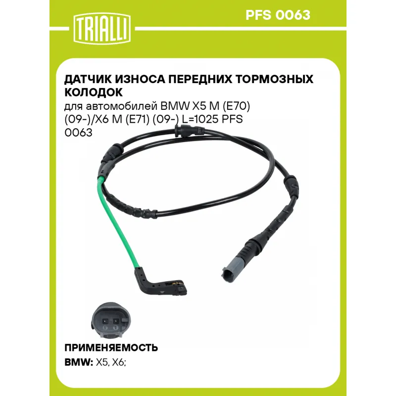 Датчик износа передних тормозных колодок для автомобилей BMW X5 M (E70) (09-)/X6 M (E71) (09-) L=1025 Характеристики: Артикул: PFS 0063 OEM номера: 34356789080 Длина, мм: 1025 Сторона установки: Передняя ось Необходимое количество: 1 на ось Количество на автомобиль: 1 Гарантийный срок: 1 год / 30.000 км Товарная линейка: BLACK Комплектация: Датчик износа - 1 шт Гарантия: от 1 года.