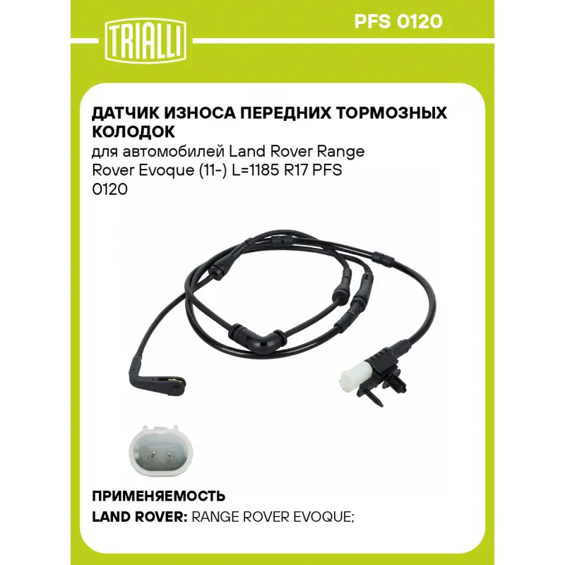 Датчик износа передних тормозных колодок для автомобилей Land Rover Range Rover Evoque (11-) L=1185 R17 Характеристики: Артикул: PFS 0120 OEM номера: LR061365, LR121267, LR118035 Длина, мм: 1185 Сторона установки: Передняя ось Необходимое количество: 1 на ось Количество на автомобиль: 1 Гарантийный срок: 1 год / 30.000 км Товарная линейка: BLACK Комплектация: Датчик износа - 1 шт Гарантия: от 1 года.